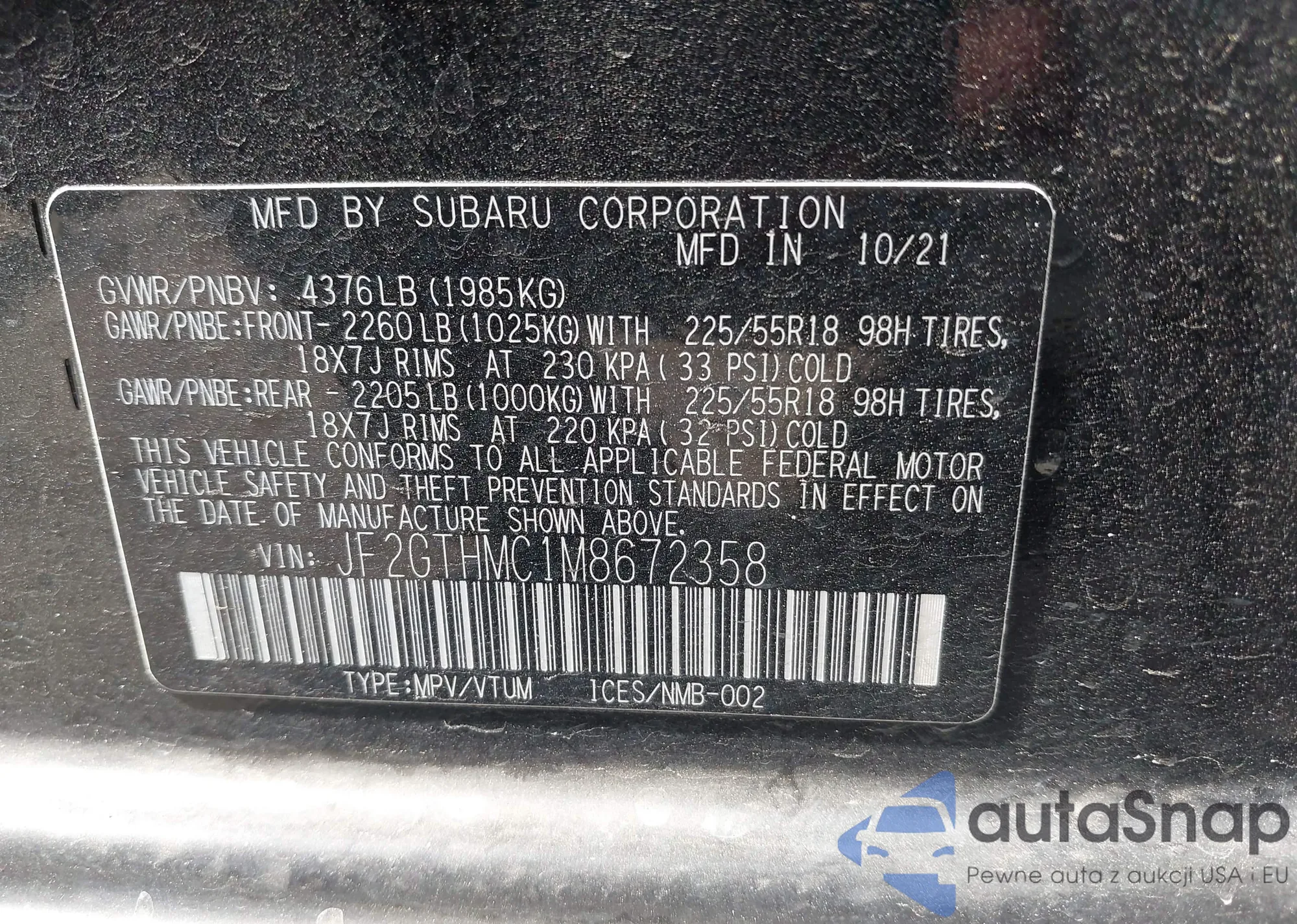 • VIN JF2GTHMC1M8672358