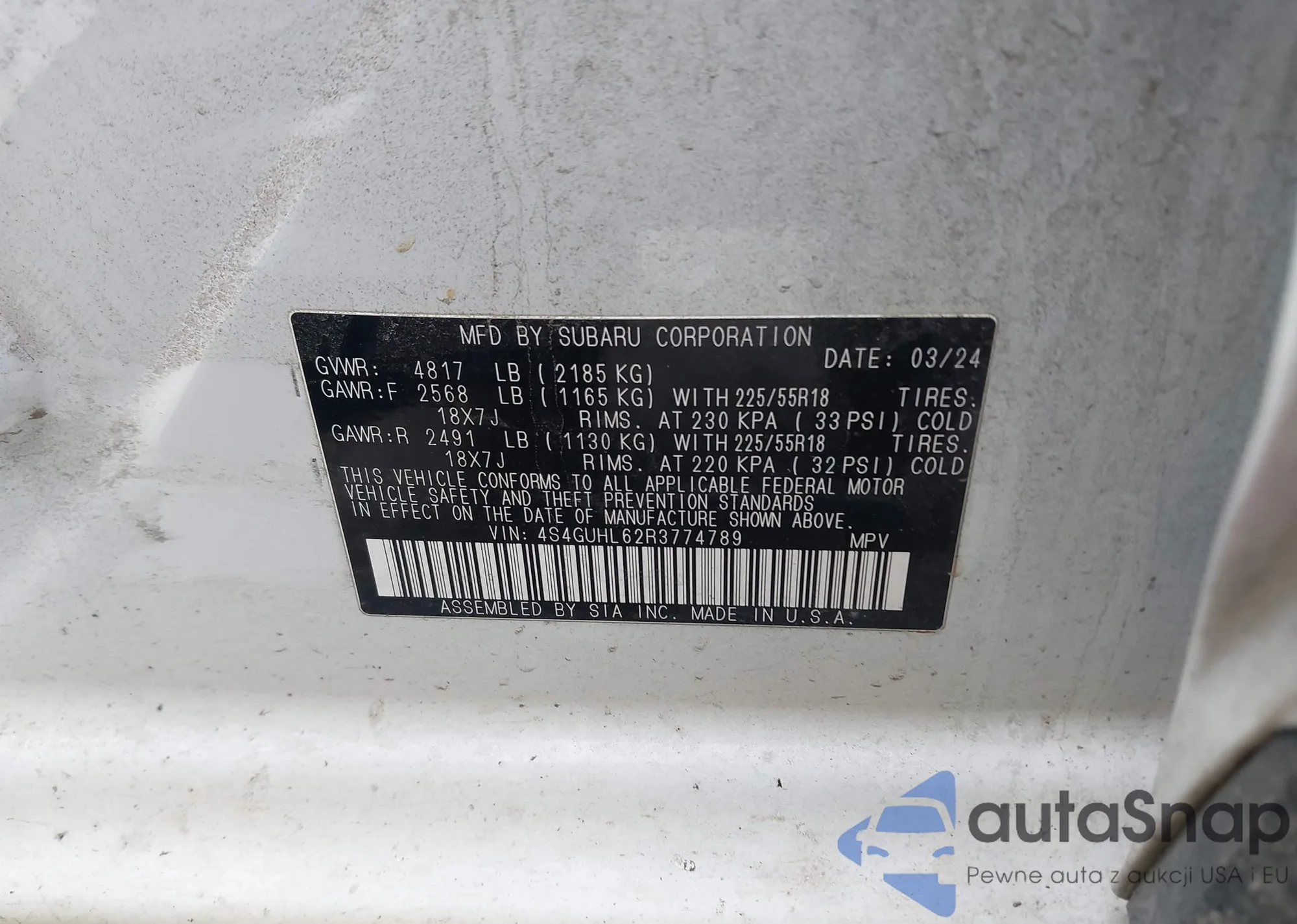 • VIN 4S4GUHL62R3774789