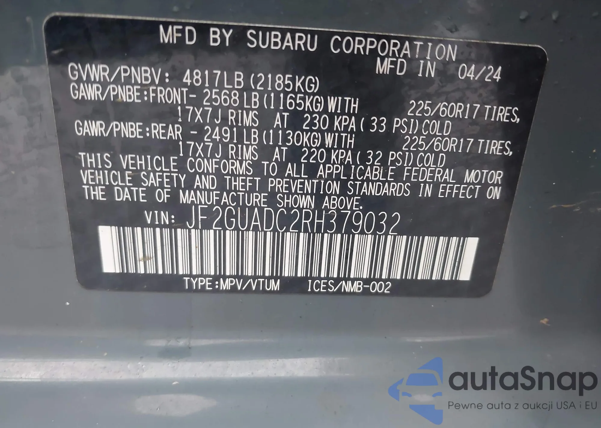 LOT: 43989230 VIN: JF2GUADC2RH379032
