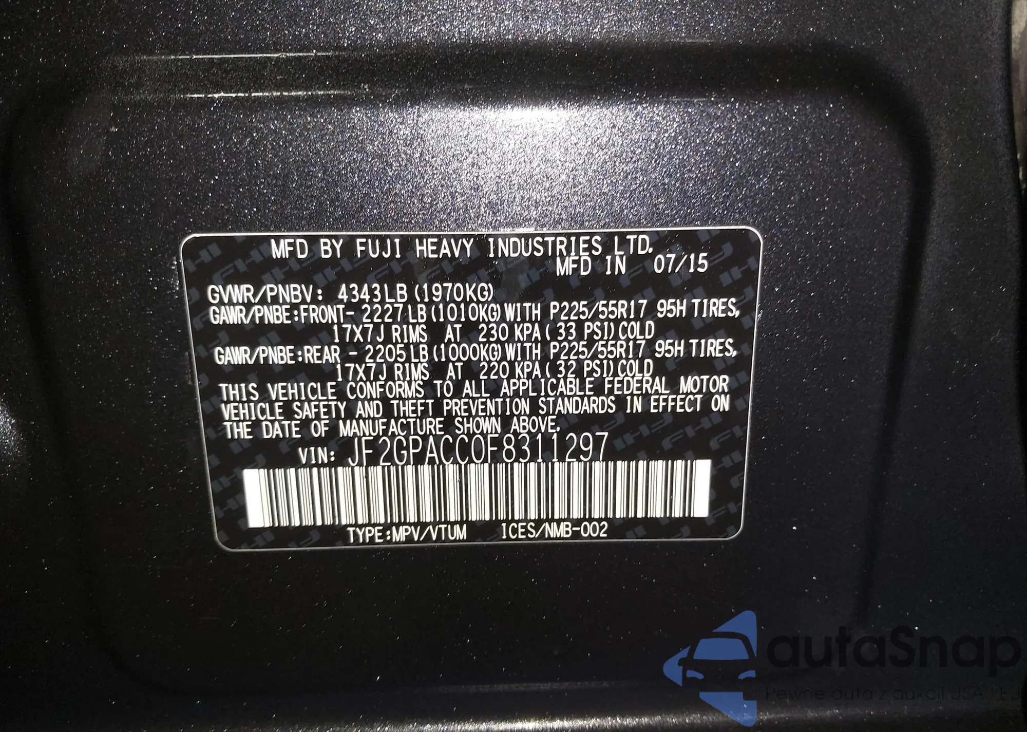 LOT: 44328306 VIN: JF2GPACC0F8311297