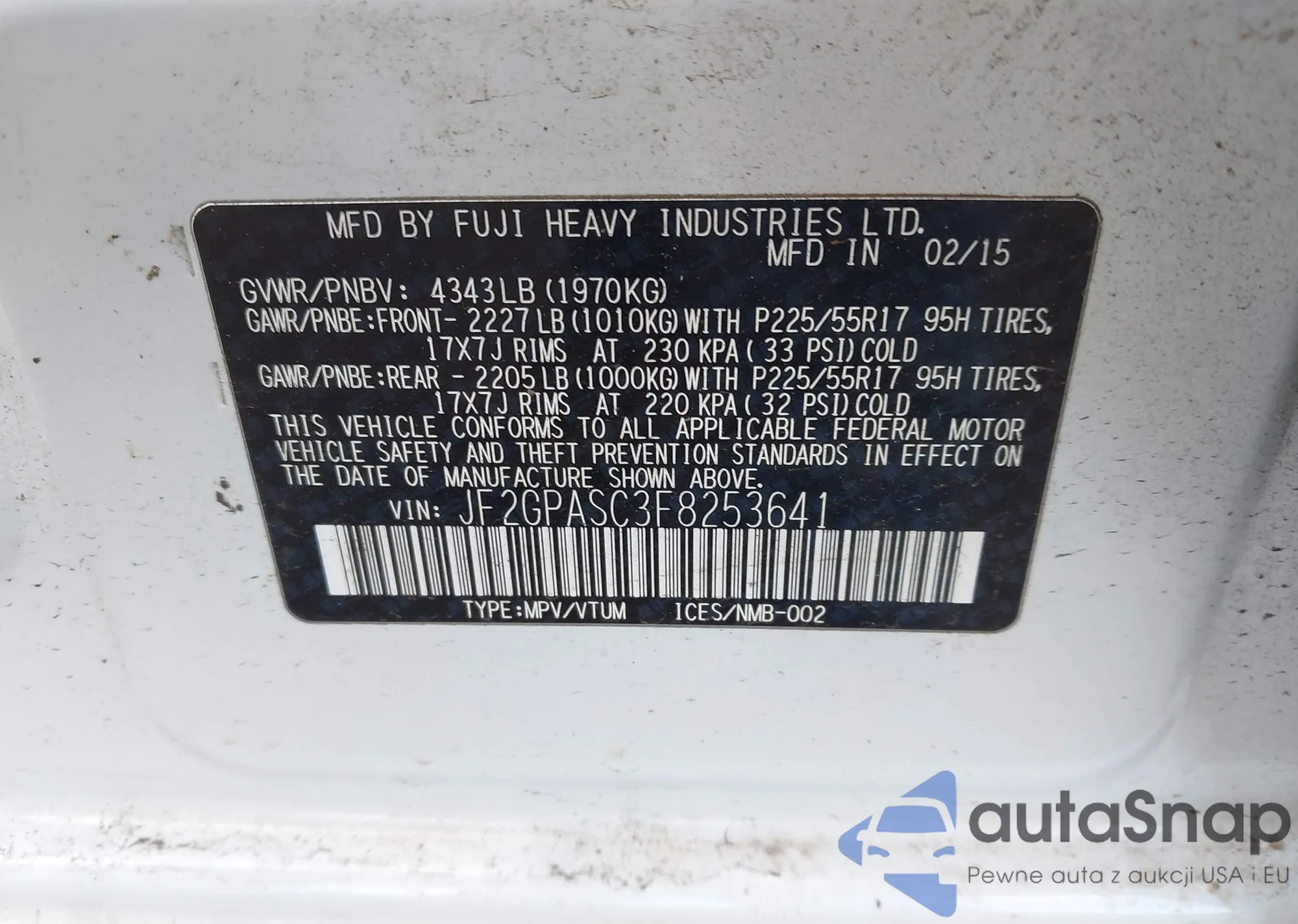 LOT: 41219749 VIN: JF2GPASC3F8253641