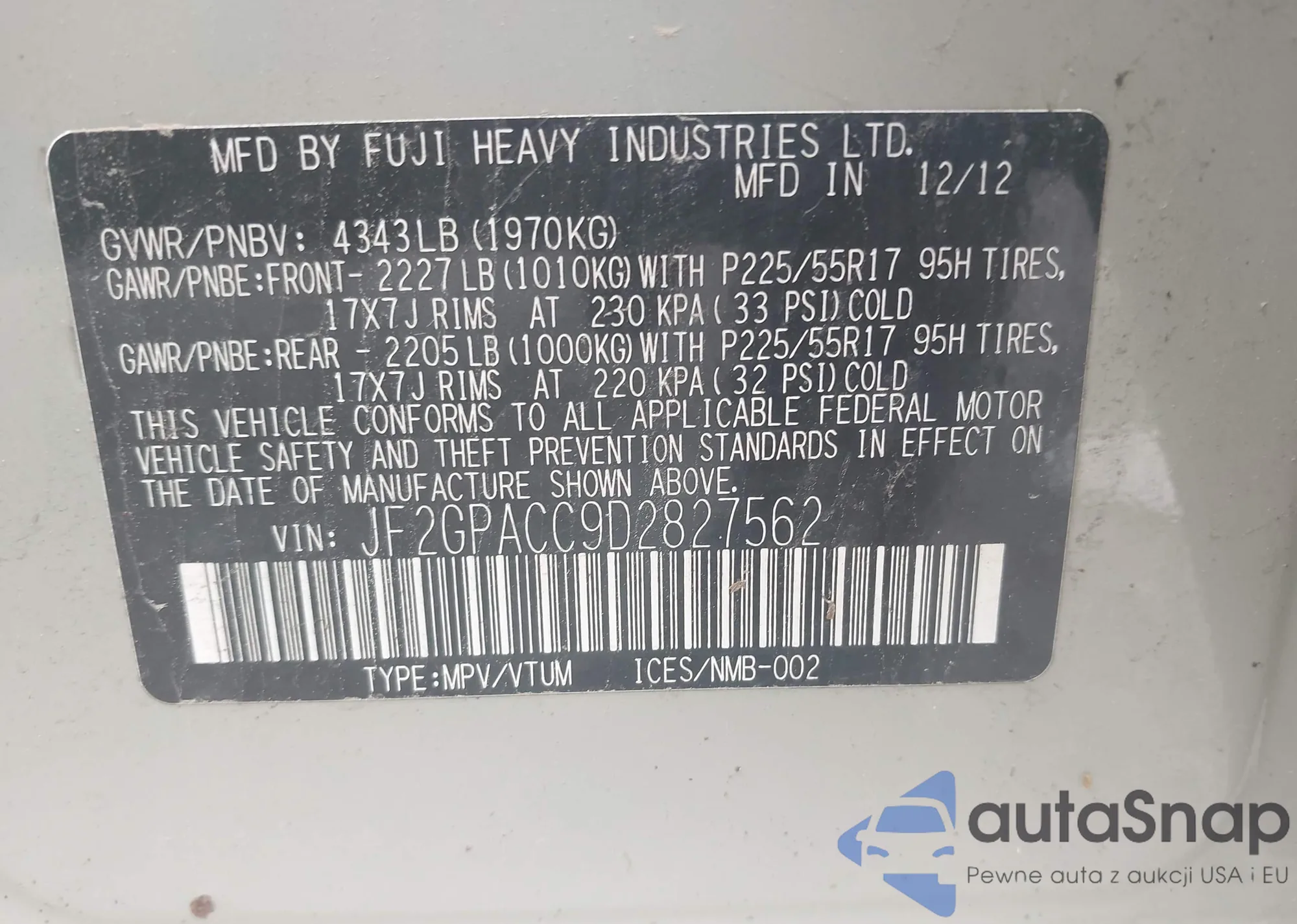 LOT: 42168019 VIN: JF2GPACC9D2827562