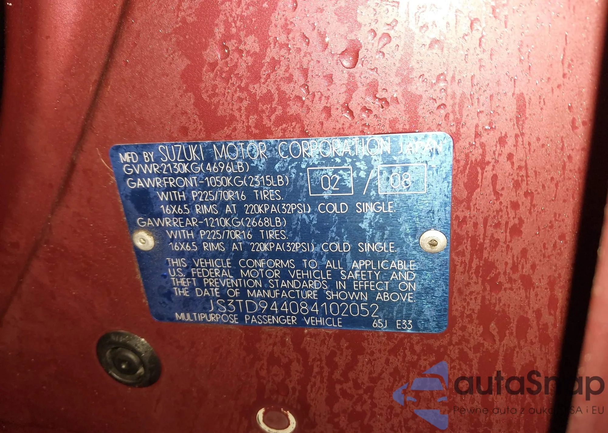 2008 Suzuki Grand Vitara z USA, uszkodzony, nr VIN JS3TE941484103322