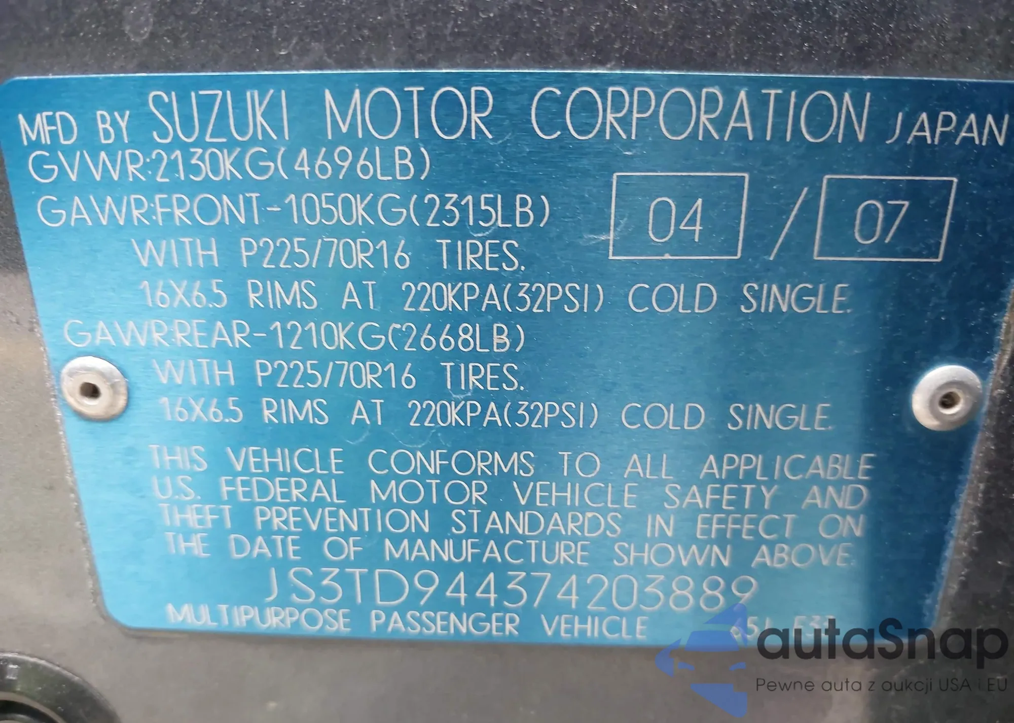 2007 Suzuki Grand Vitara z USA, uszkodzony, nr VIN JS3TE941074200421