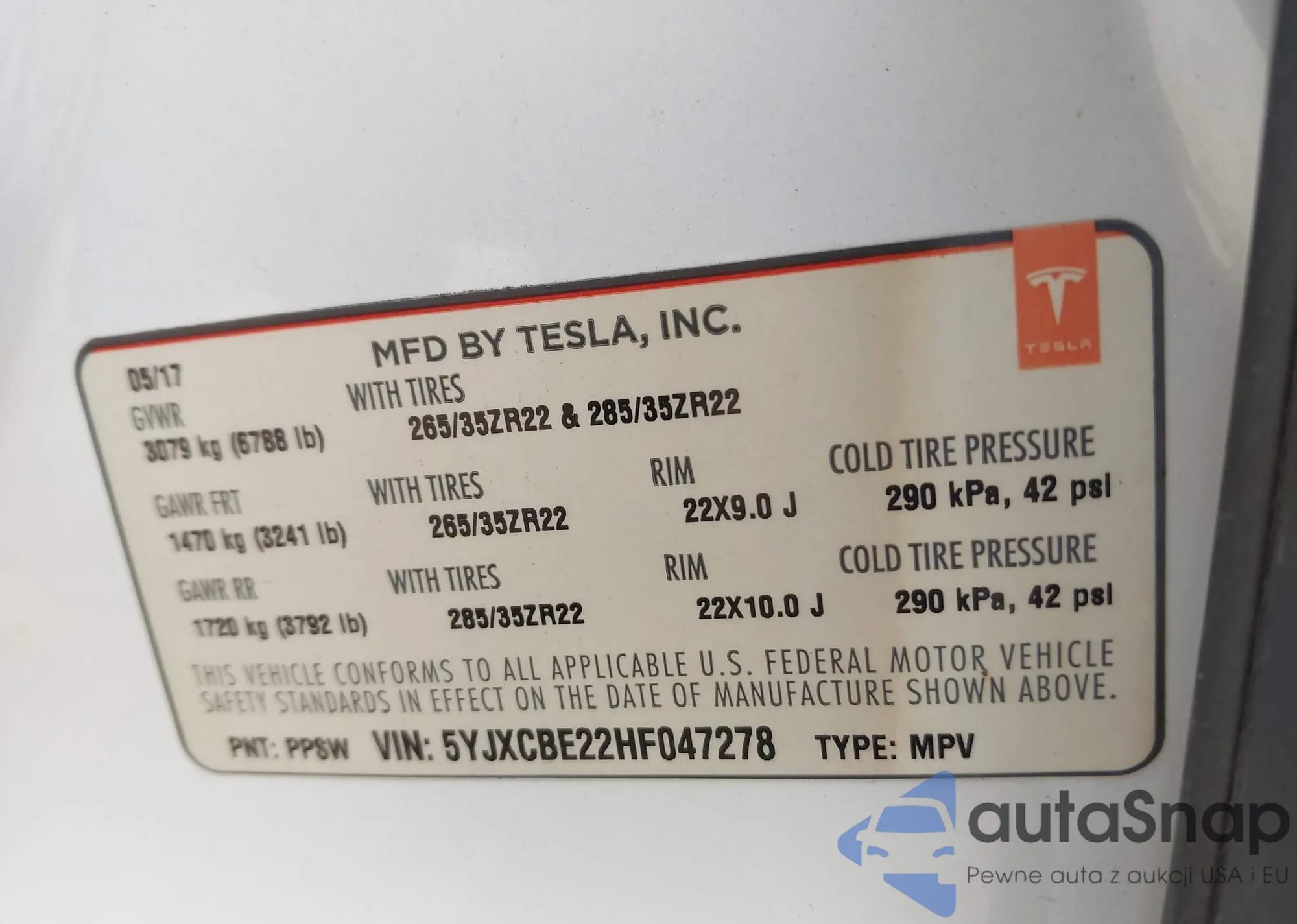 2017 Tesla Model X 100D/75D/90D z USA, uszkodzony, nr VIN 5YJXCBE22HF047278