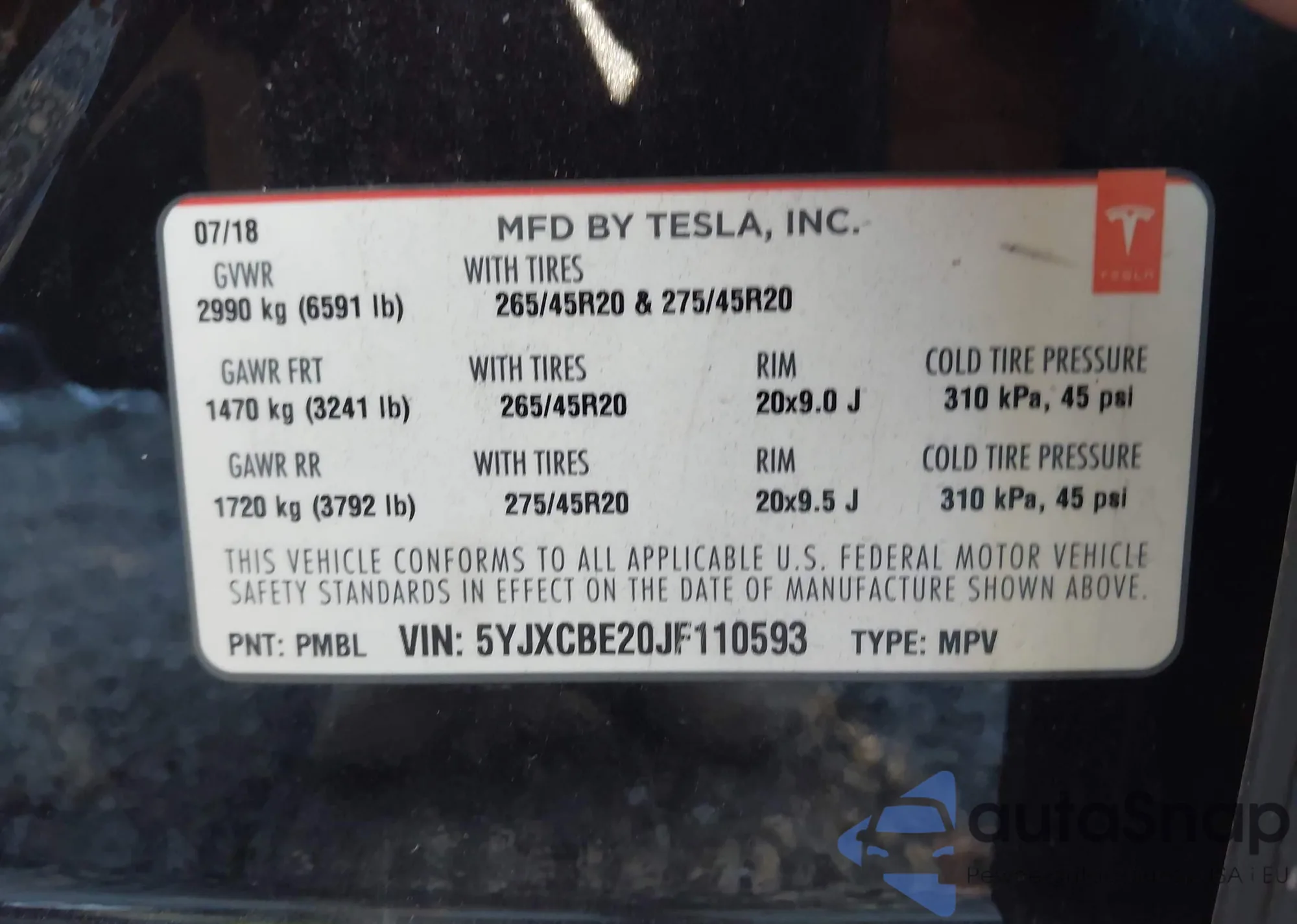 2018 Tesla Model X 100D/75D/P100D z USA, uszkodzony, nr VIN 5YJXCAE26JF103125