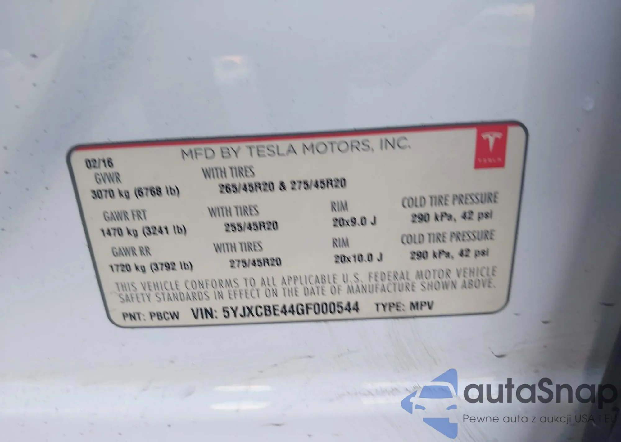 2016 Tesla Model X 75D/P100D/P90D z USA, uszkodzony, nr VIN 5YJXCBE44GF000544