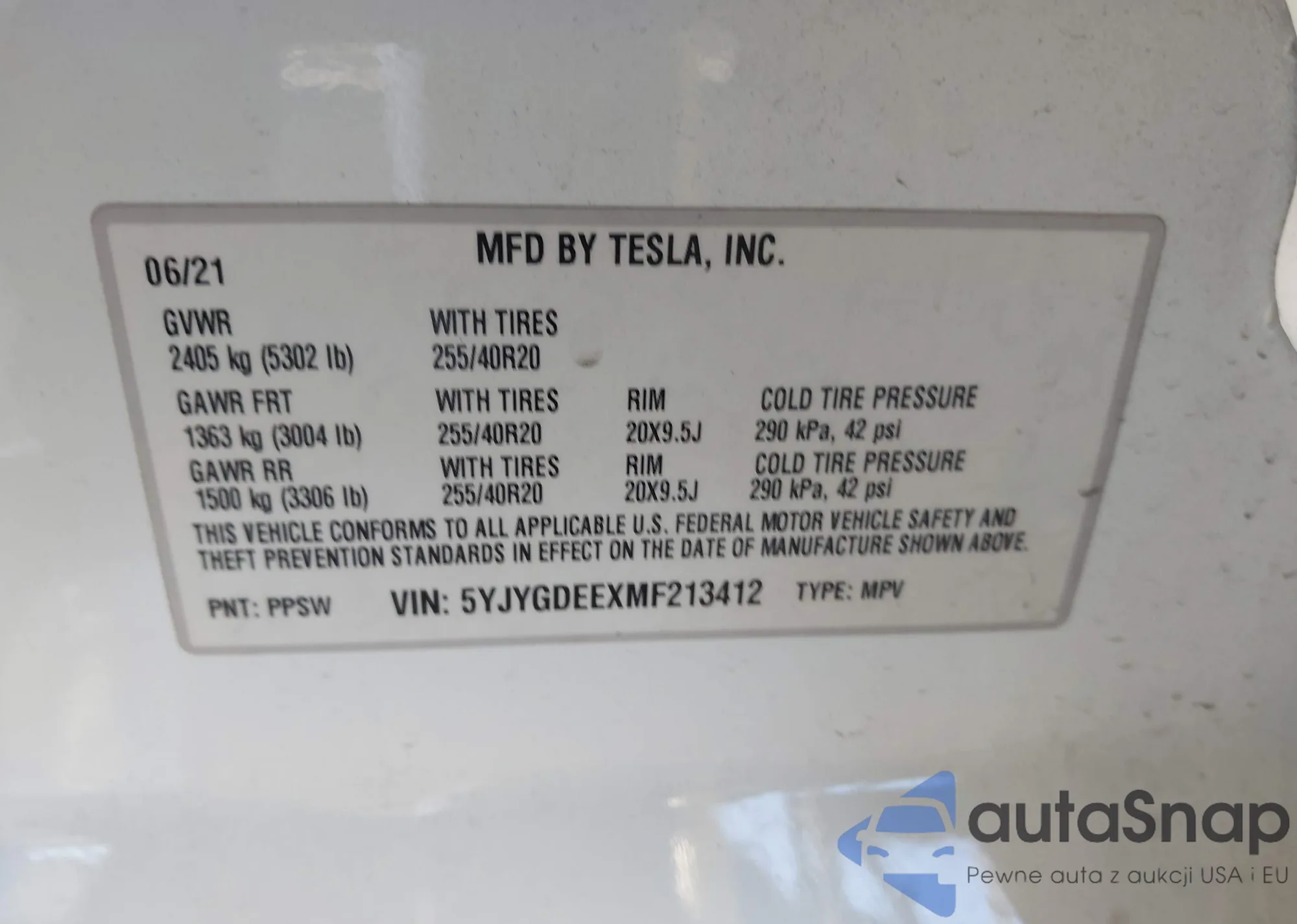 2021 Tesla Model Y z USA, uszkodzony, nr VIN 5YJYGDEEXMF213412
