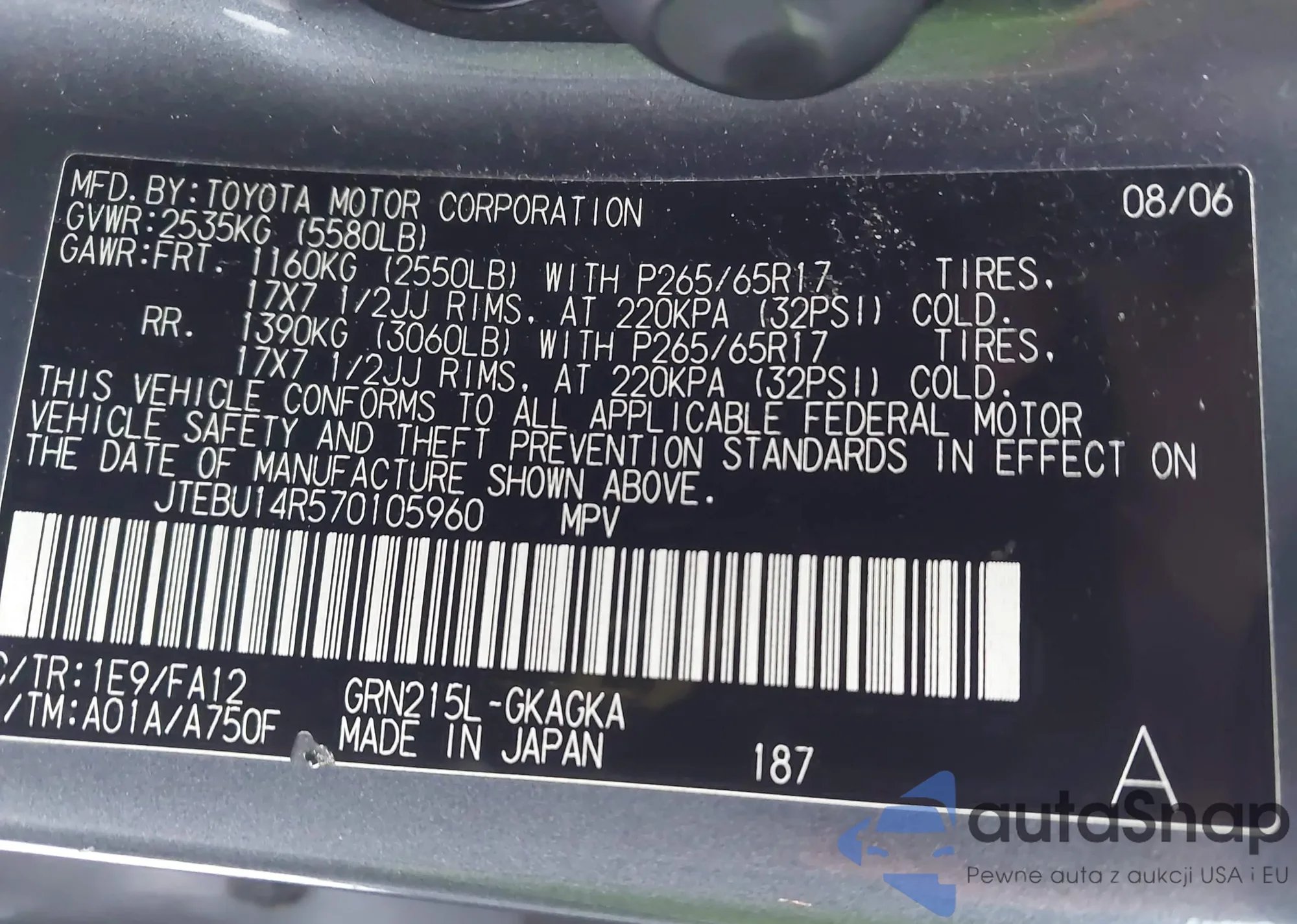 LOT: 43932892 VIN: JTEBU14R570105960