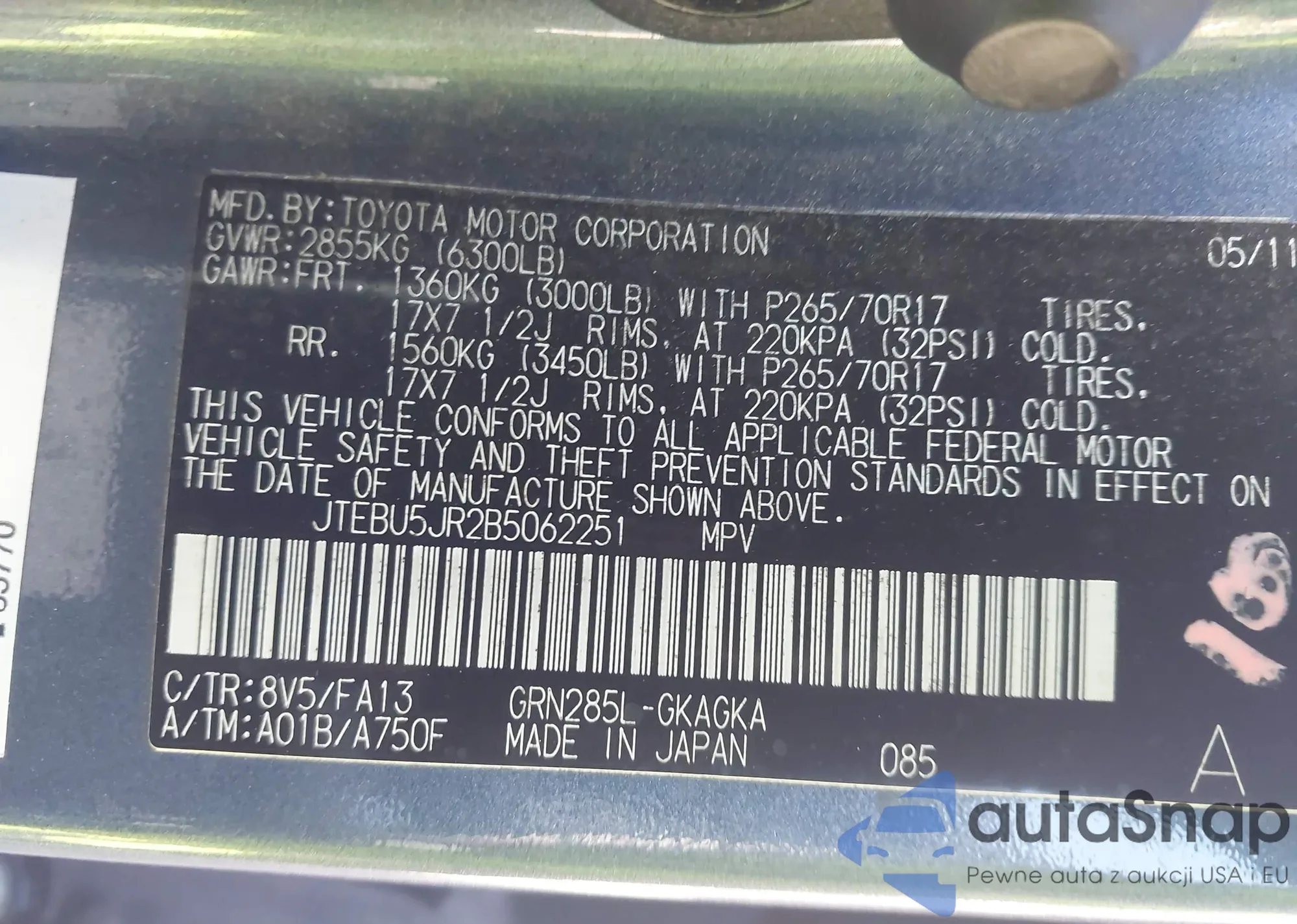 LOT: 44448761 VIN: JTEBU5JR2B5062251