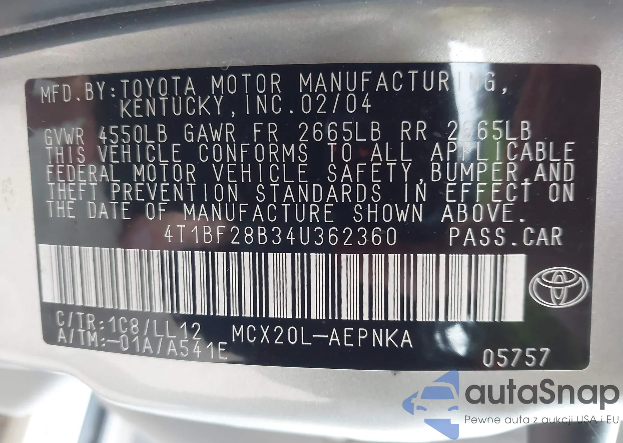 • VIN 4T1BF28B34U362360