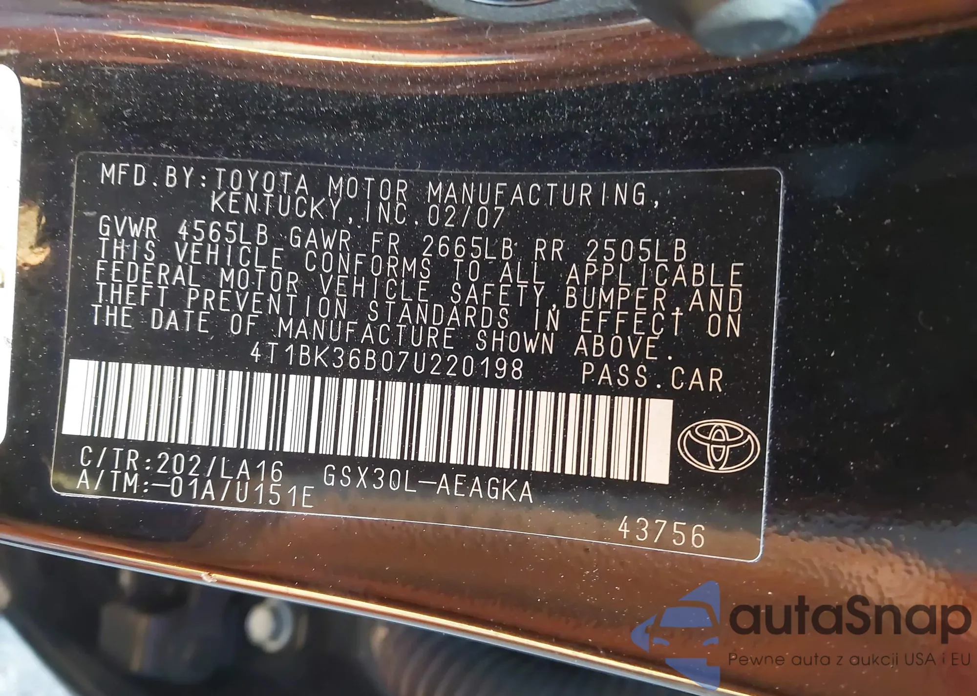 • VIN 4T1BK36B07U220198