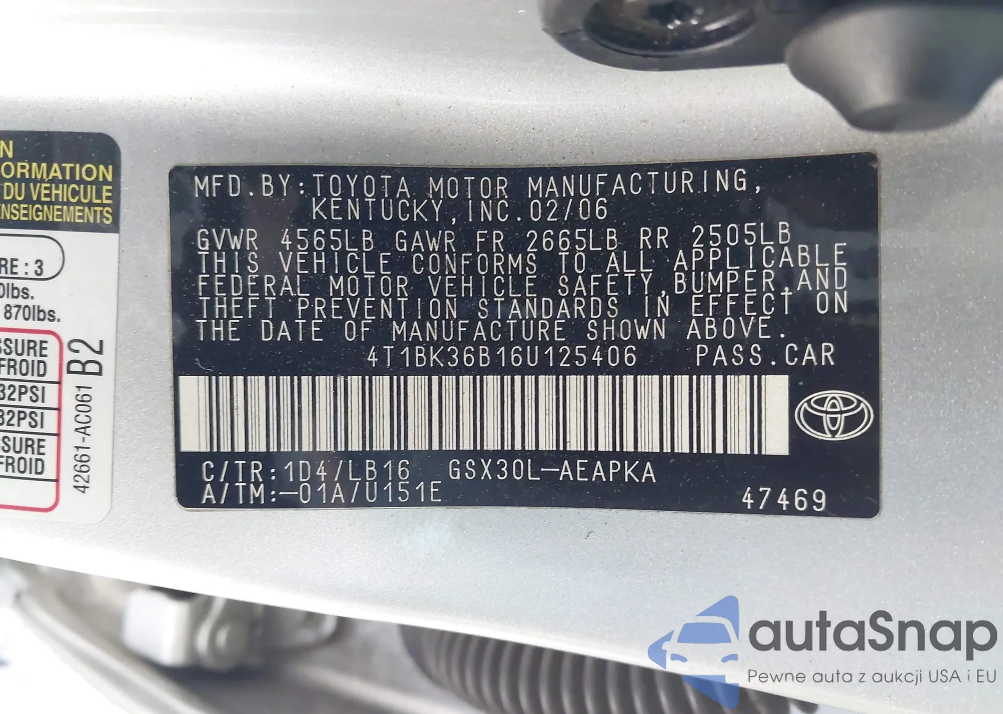 LOT: 44134784 VIN: 4T1BK36B16U125406