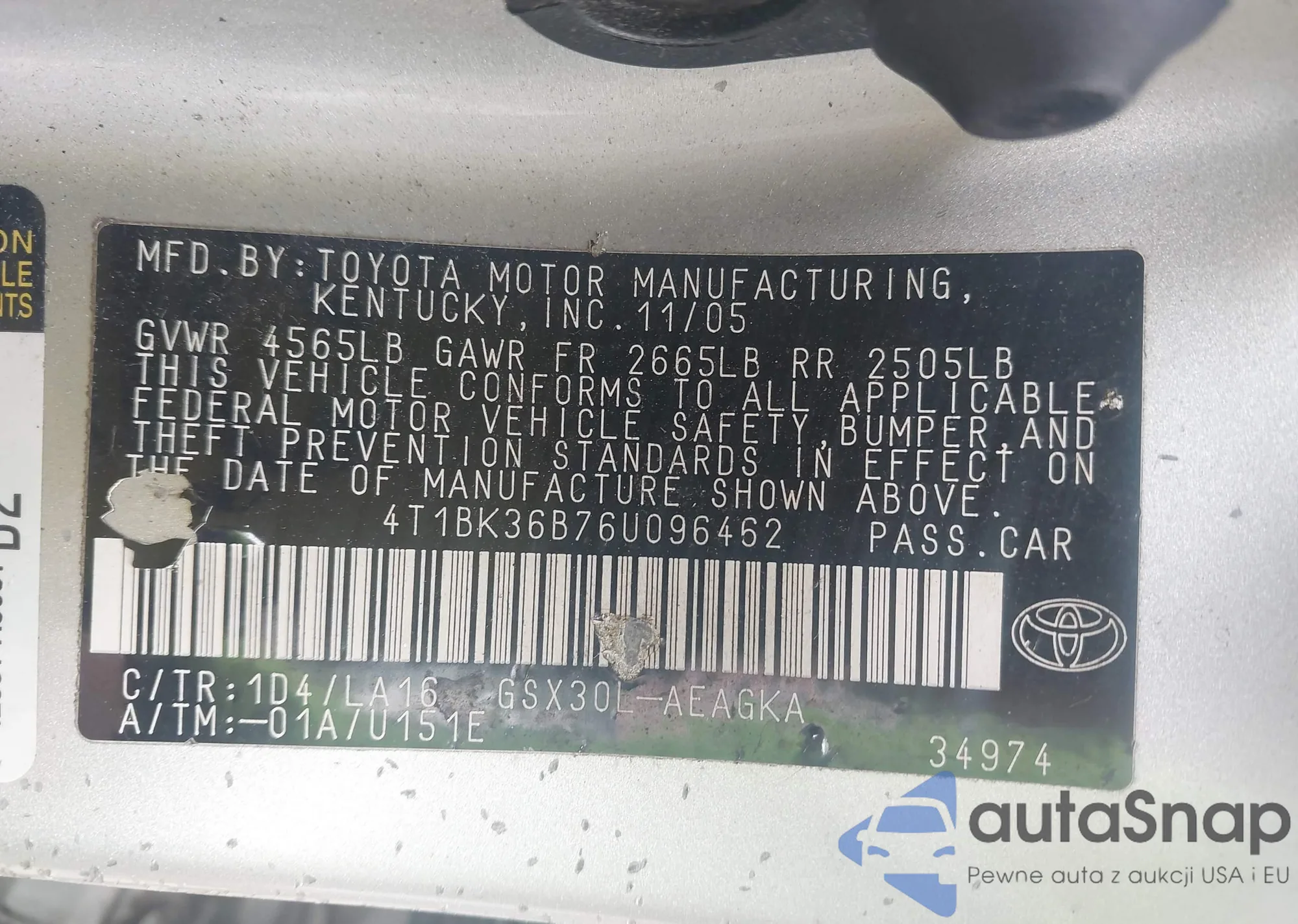 LOT: 44617273 VIN: 4T1BK36B76U074509