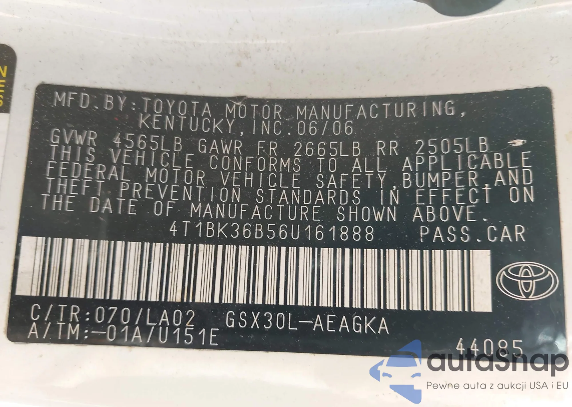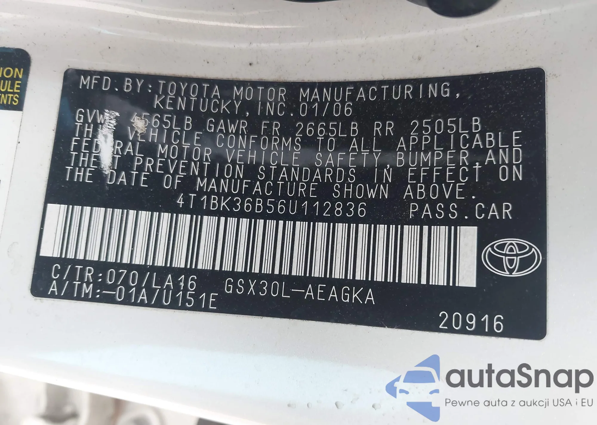 LOT: 44637341 VIN: 4T1BK36B56U161888
