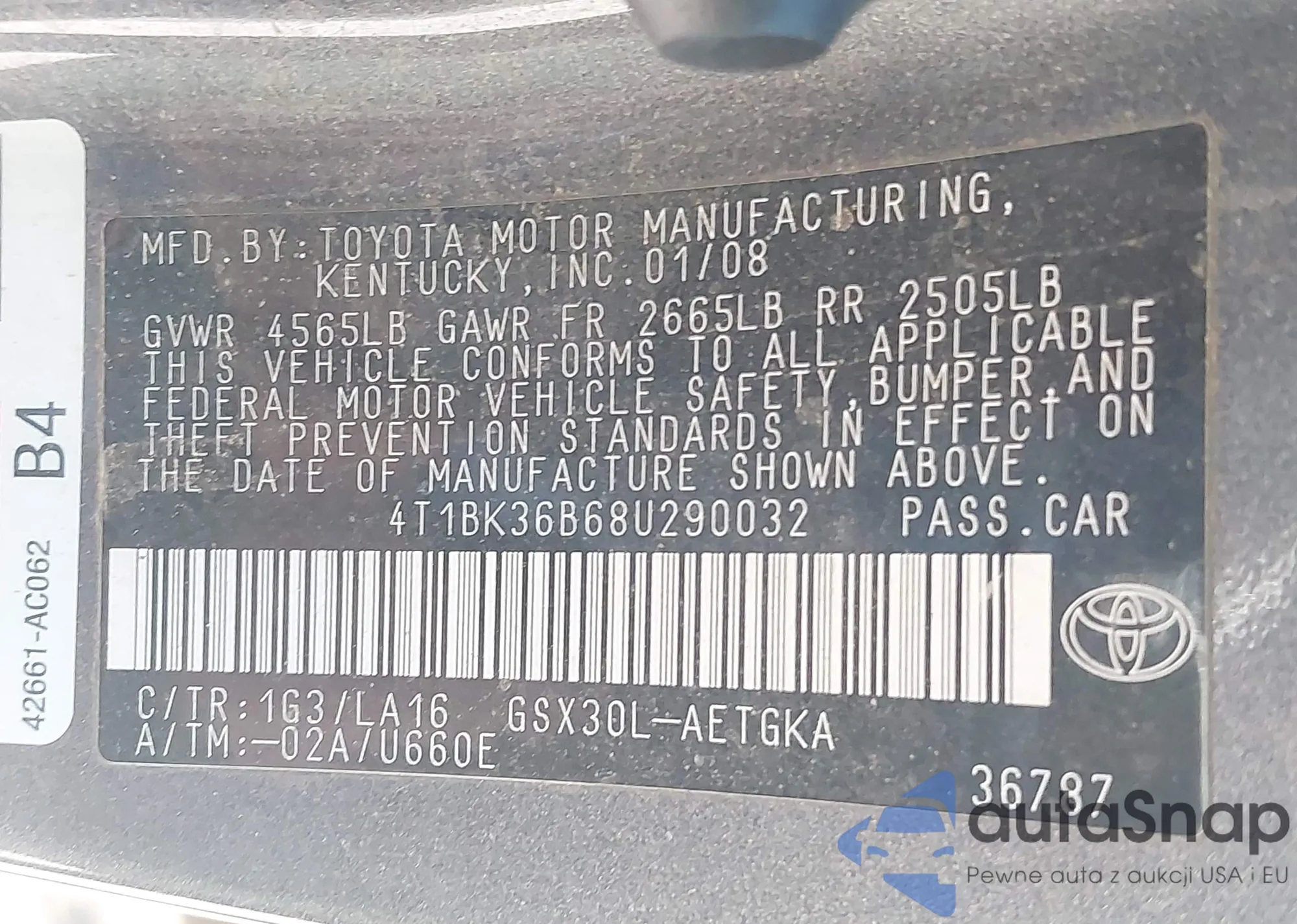 LOT: 43905235 VIN: 4T1BK36B68U290032