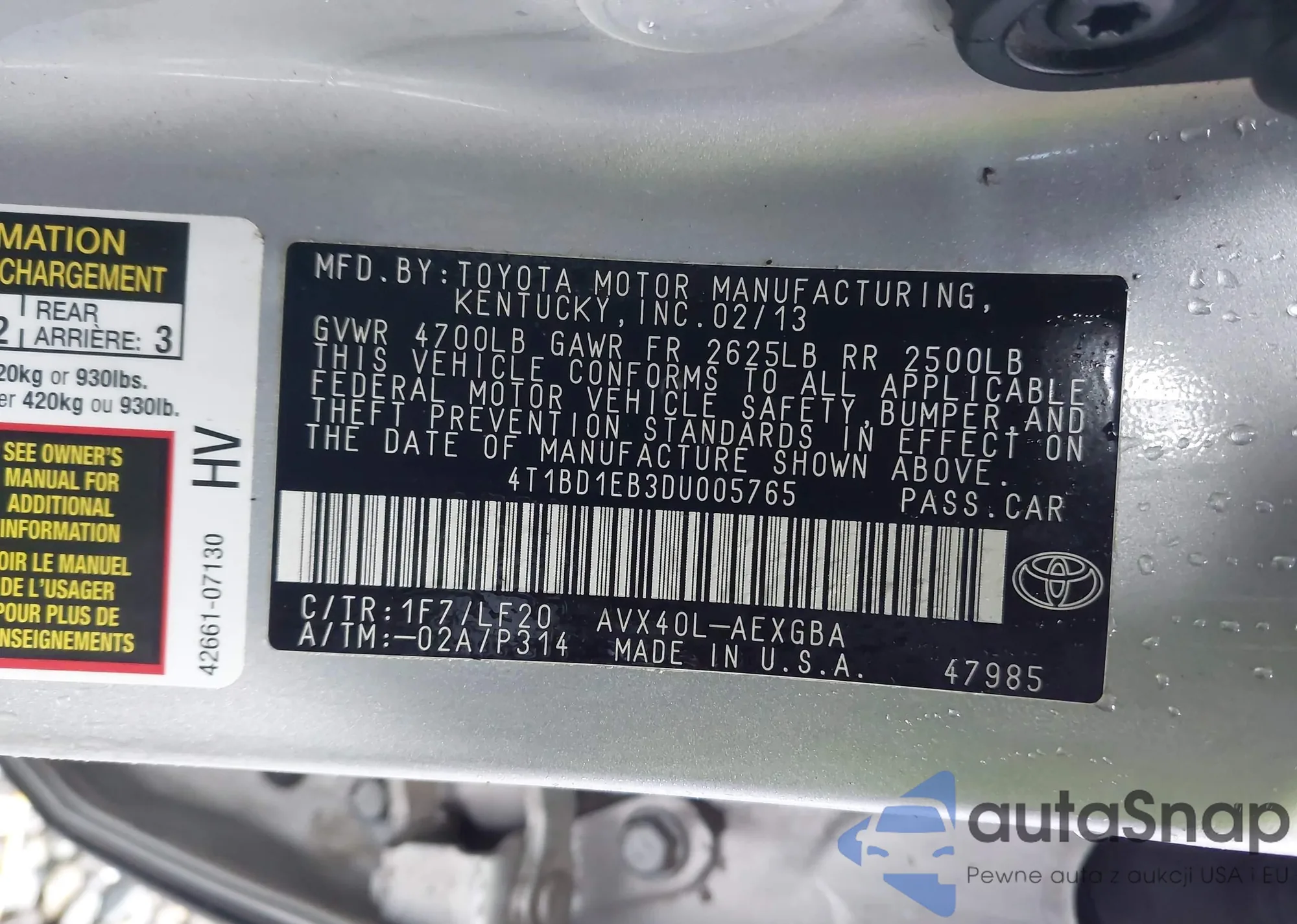 • VIN 4T1BD1EB3DU005765
