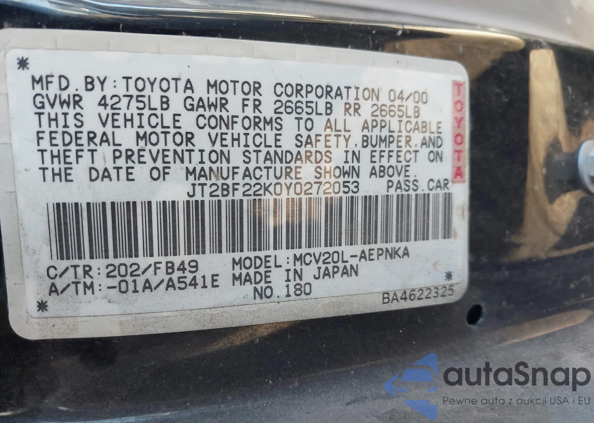 LOT: 44278330 VIN: JT2BF22K0Y0272053