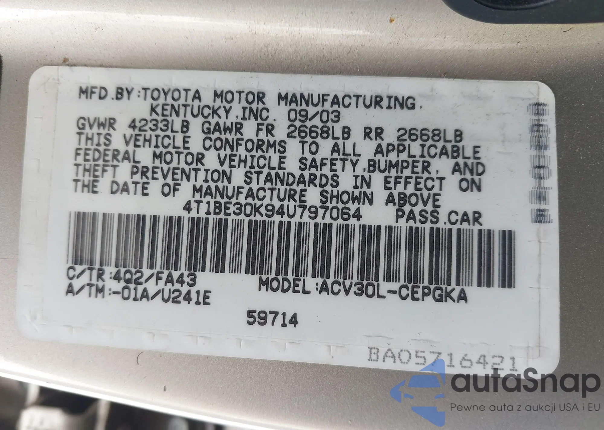 • VIN 4T1BE30K03U222401
