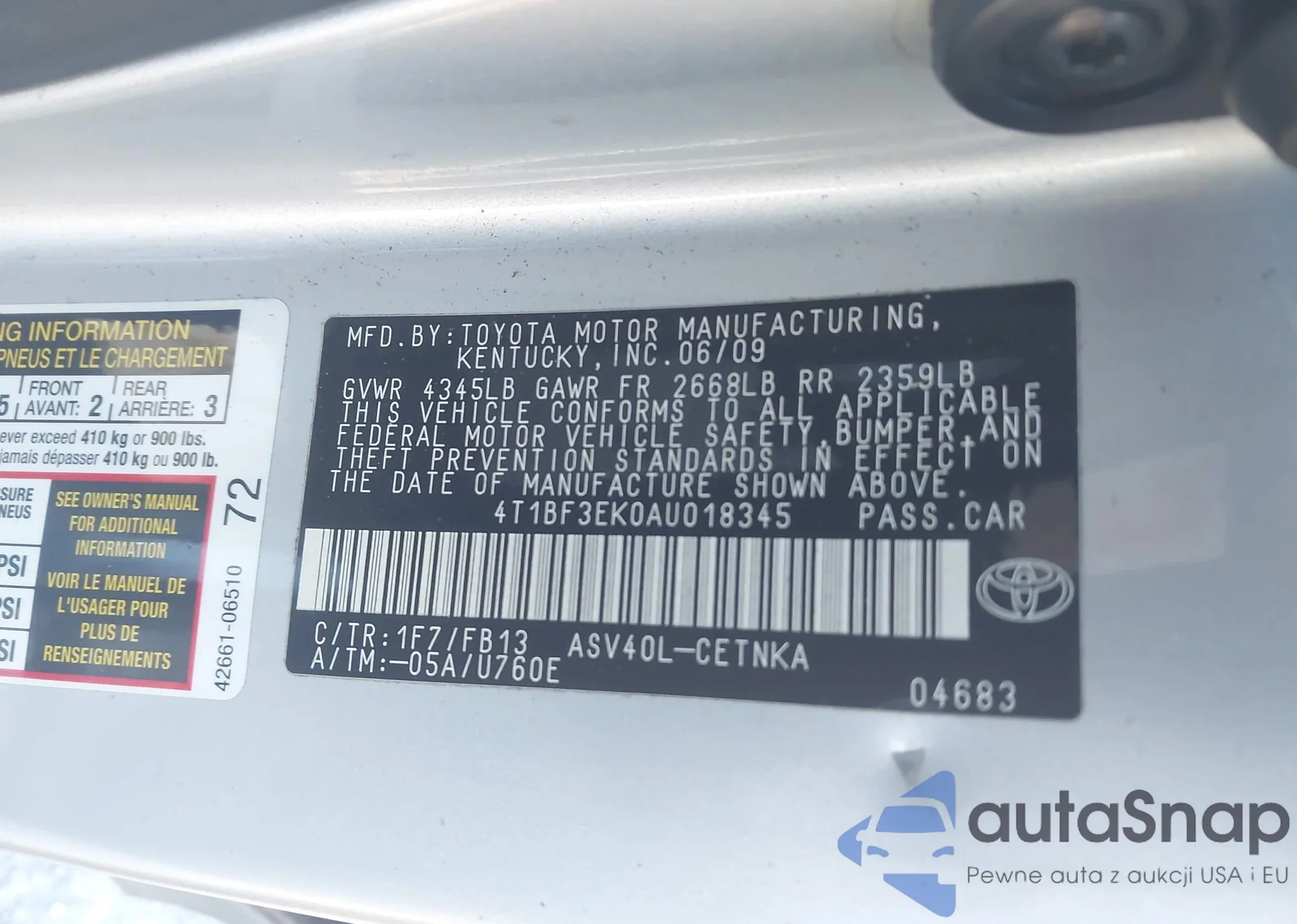 • VIN 4T1BF3EK0AU018345