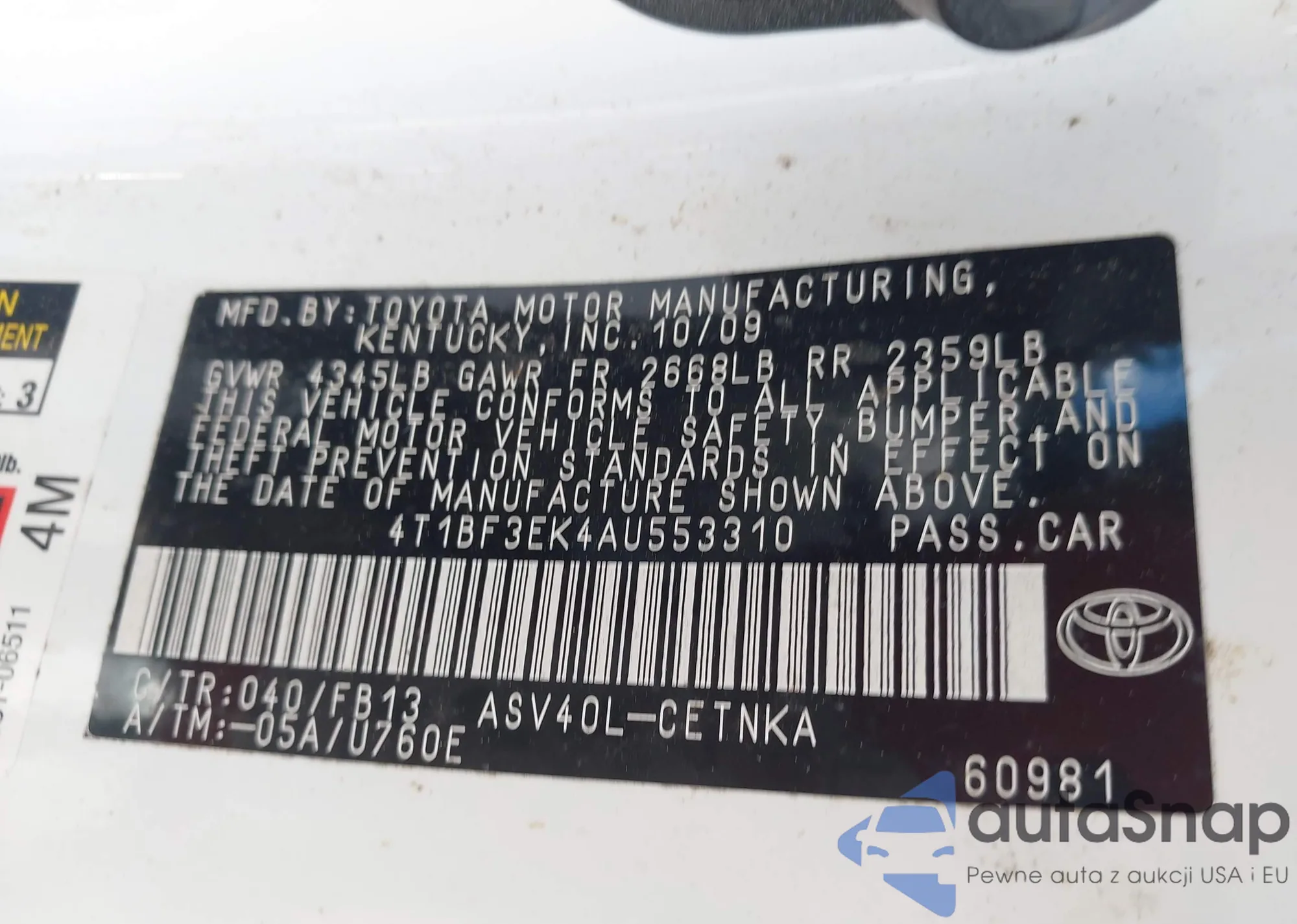 • VIN 4T1BF3EK4AU553310