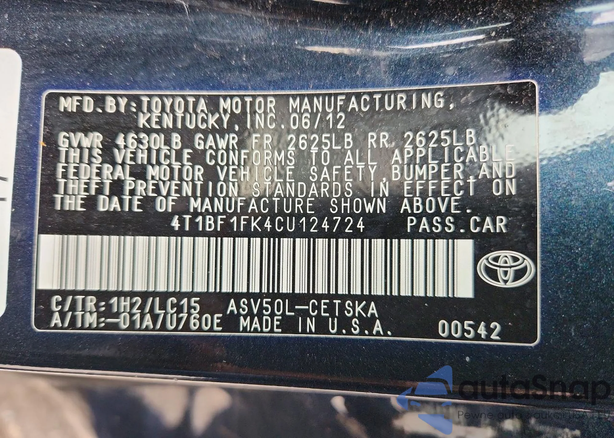 • VIN 4T1BF1FK4CU124724