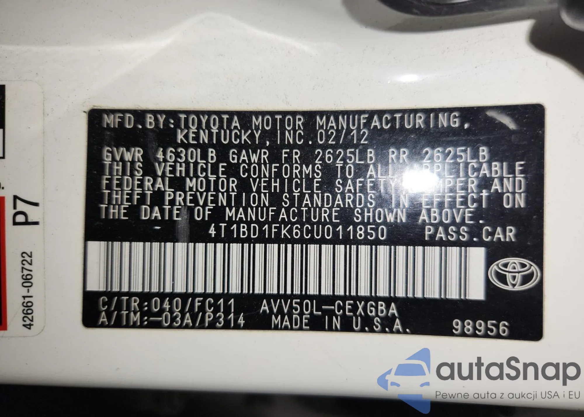 LOT: 91742785 VIN: 4T1BD1FK6CU011850