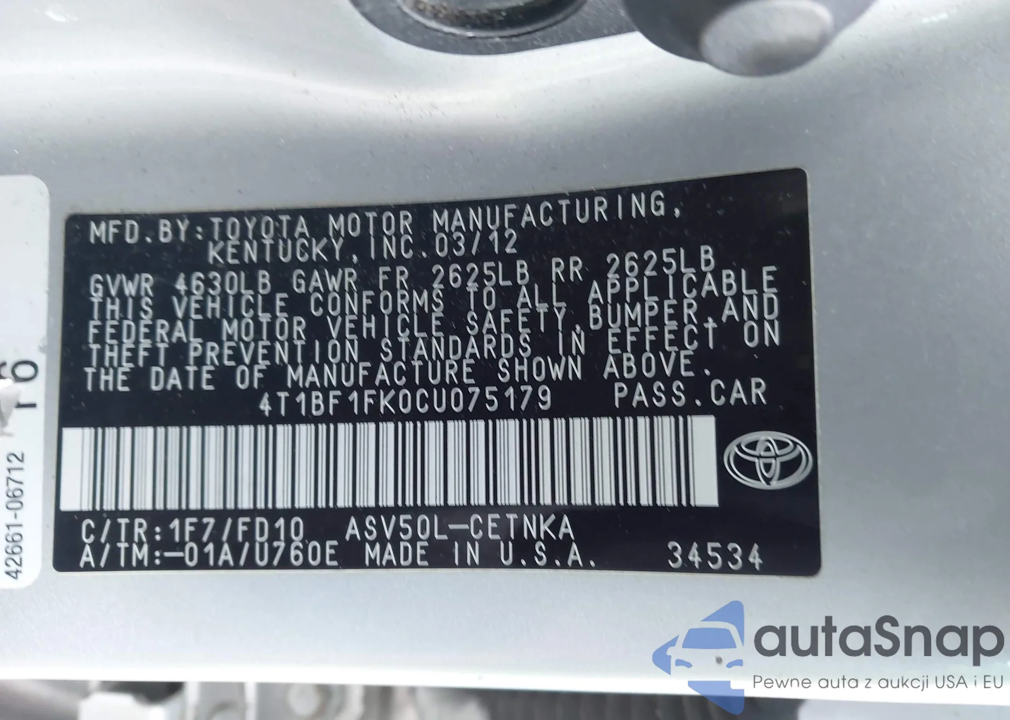 • VIN 4T1BF1FK0CU075179