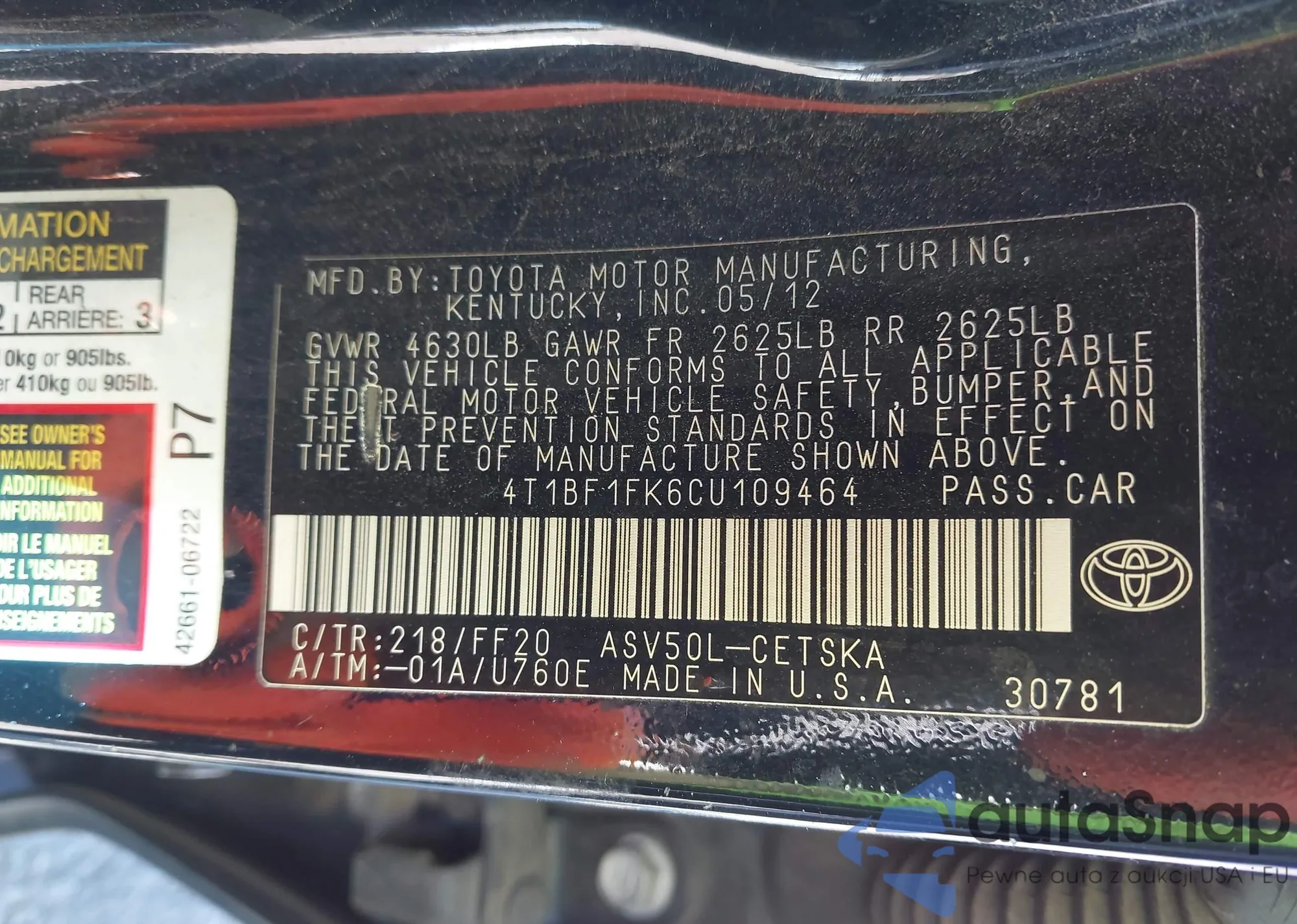• VIN 4T1BF1FK6CU109464