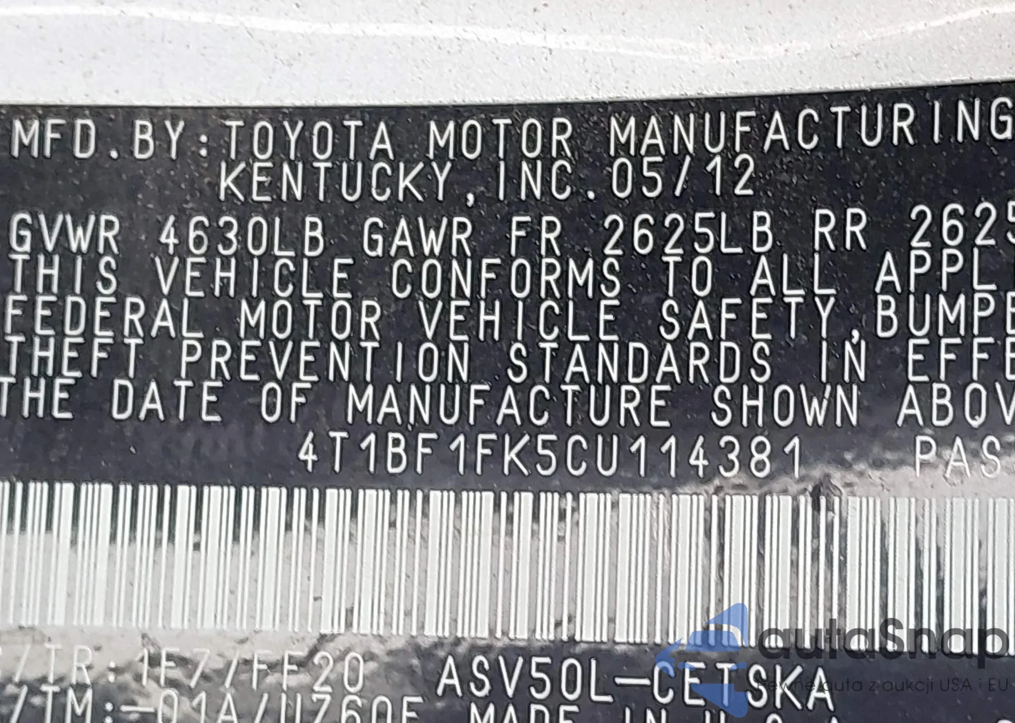 • VIN 4T1BF1FK5CU114381
