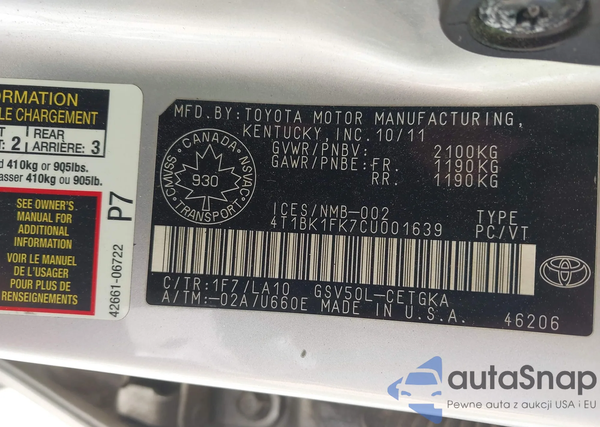 • VIN 4T1BK1FK7CU001639