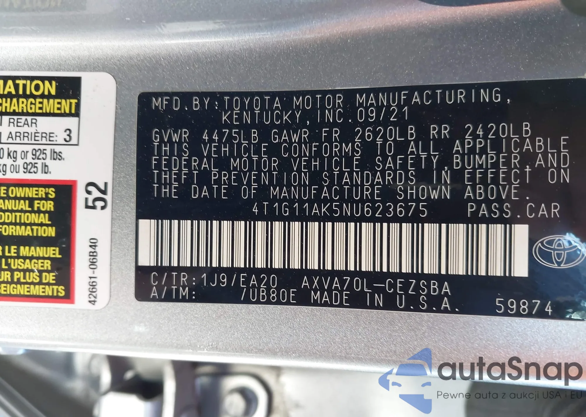 LOT: 44045526 VIN: 4T1G11AK5NU623675