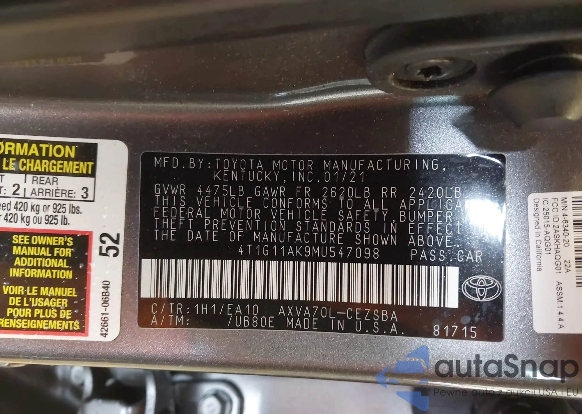 LOT: 44102909 VIN: 4T1F11AK0MU564531