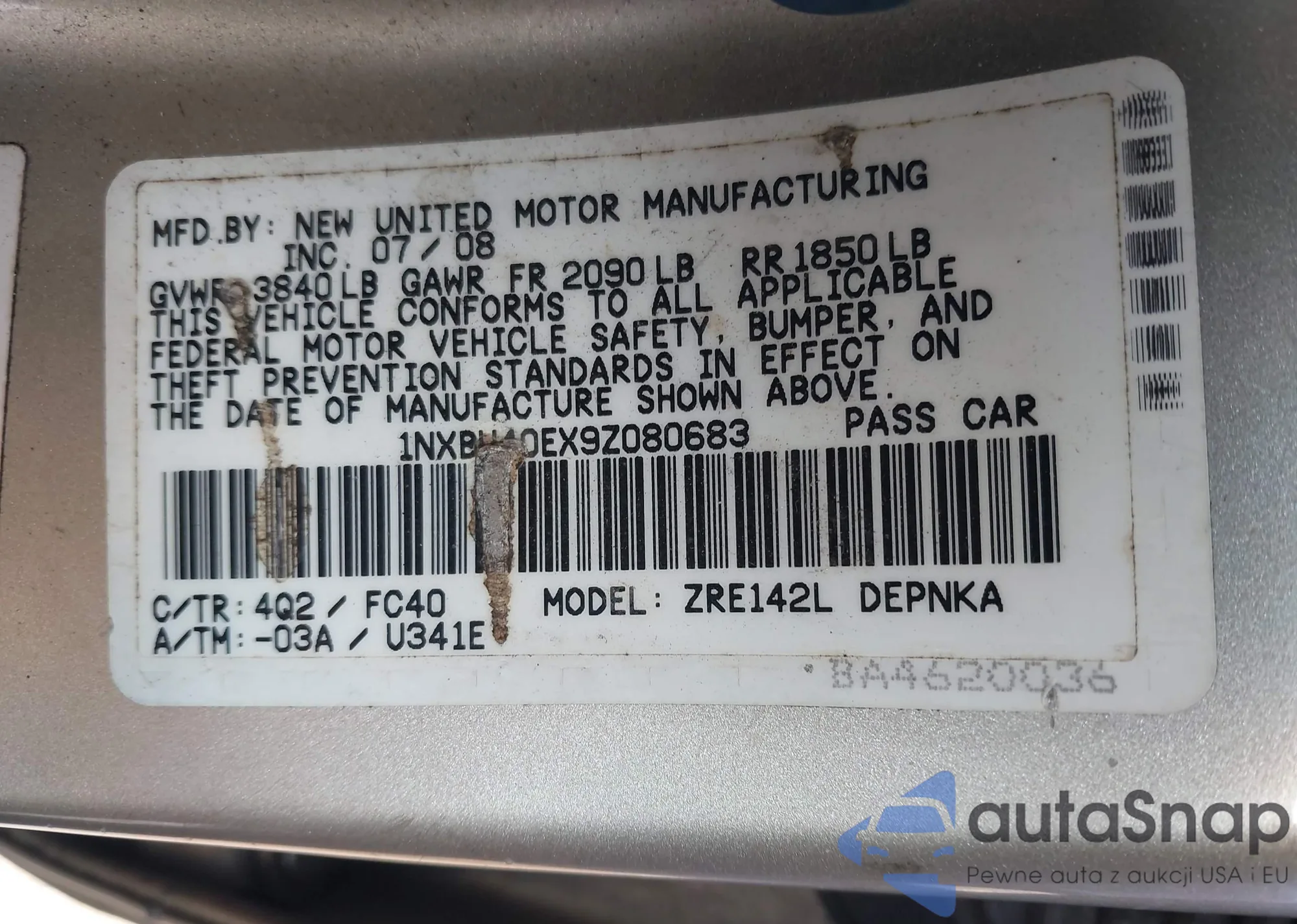 • VIN 1NXBU40EX9Z080683