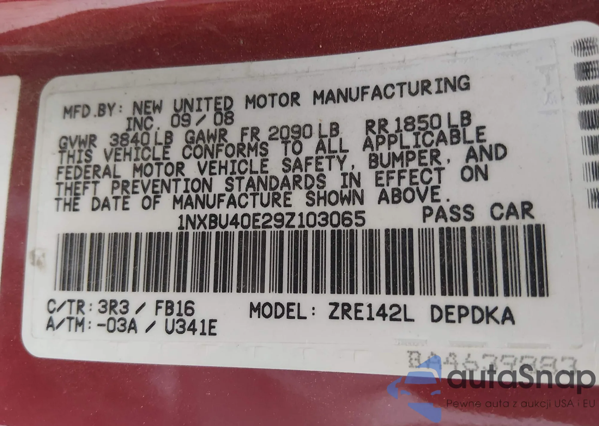 LOT: 43951525 VIN: 1NXBU40E29Z103065