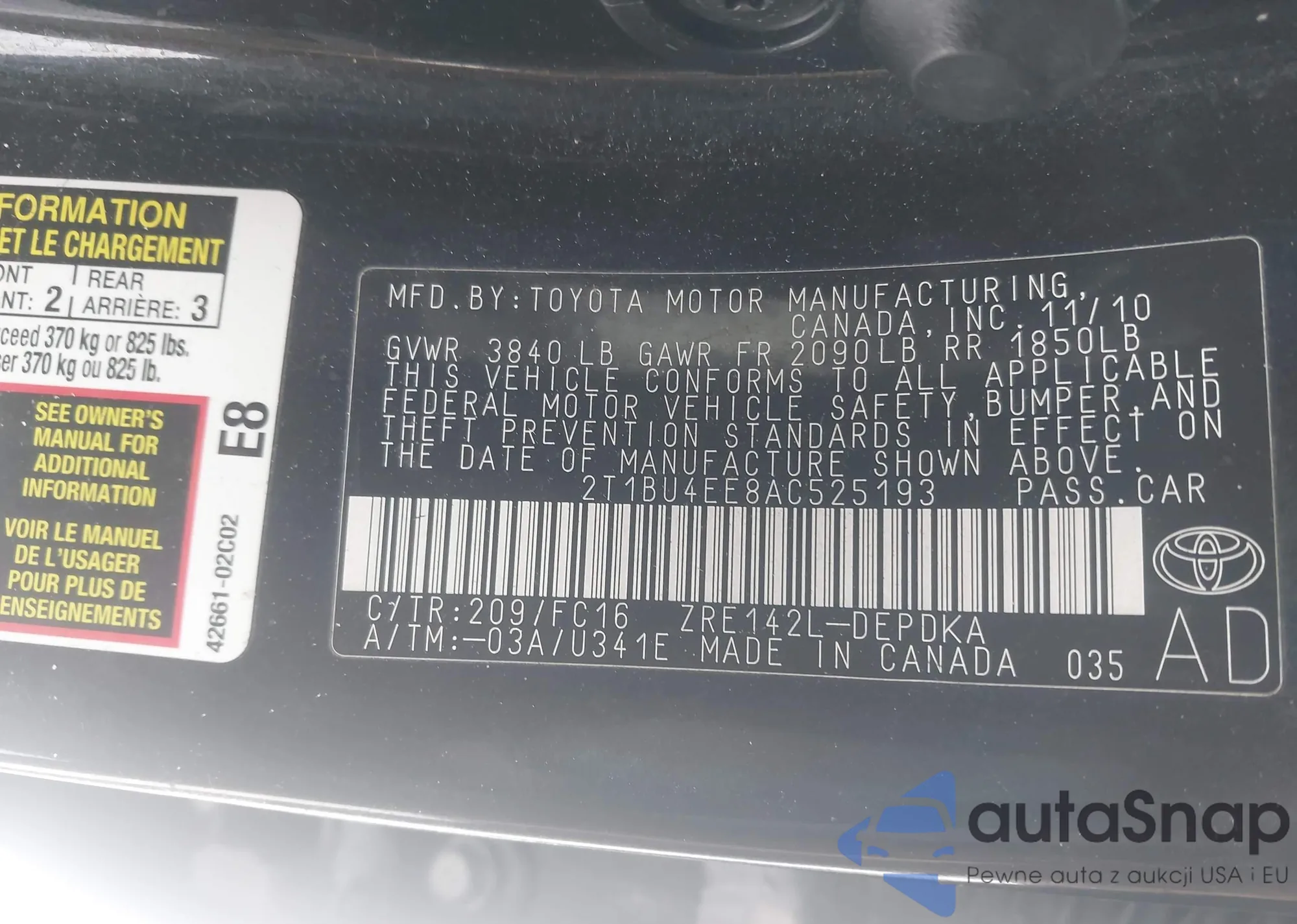 LOT: 44308738 VIN: 1NXBU4EE2AZ305238