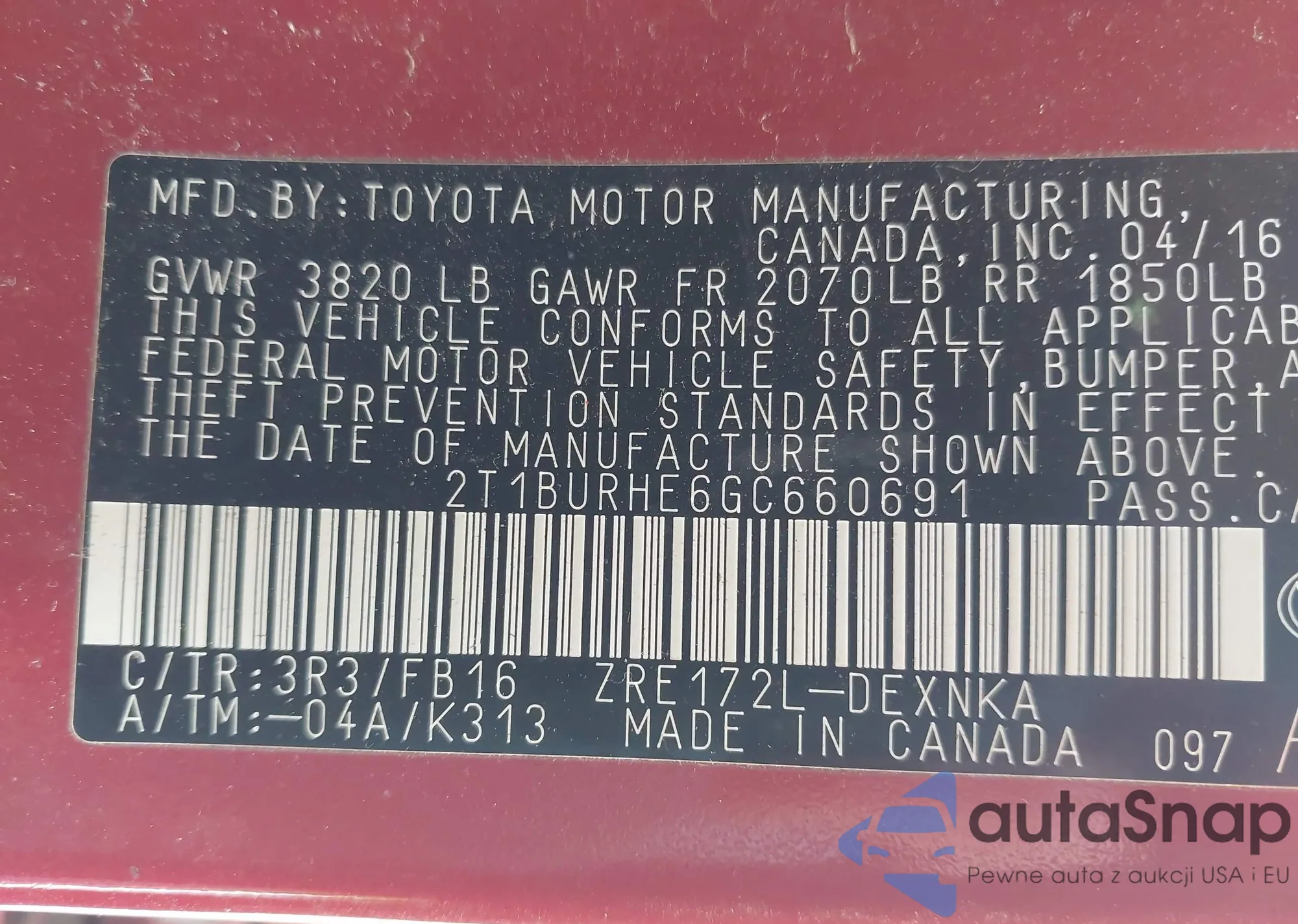 LOT: 44216676 VIN: 2T1BURHE6GC660691