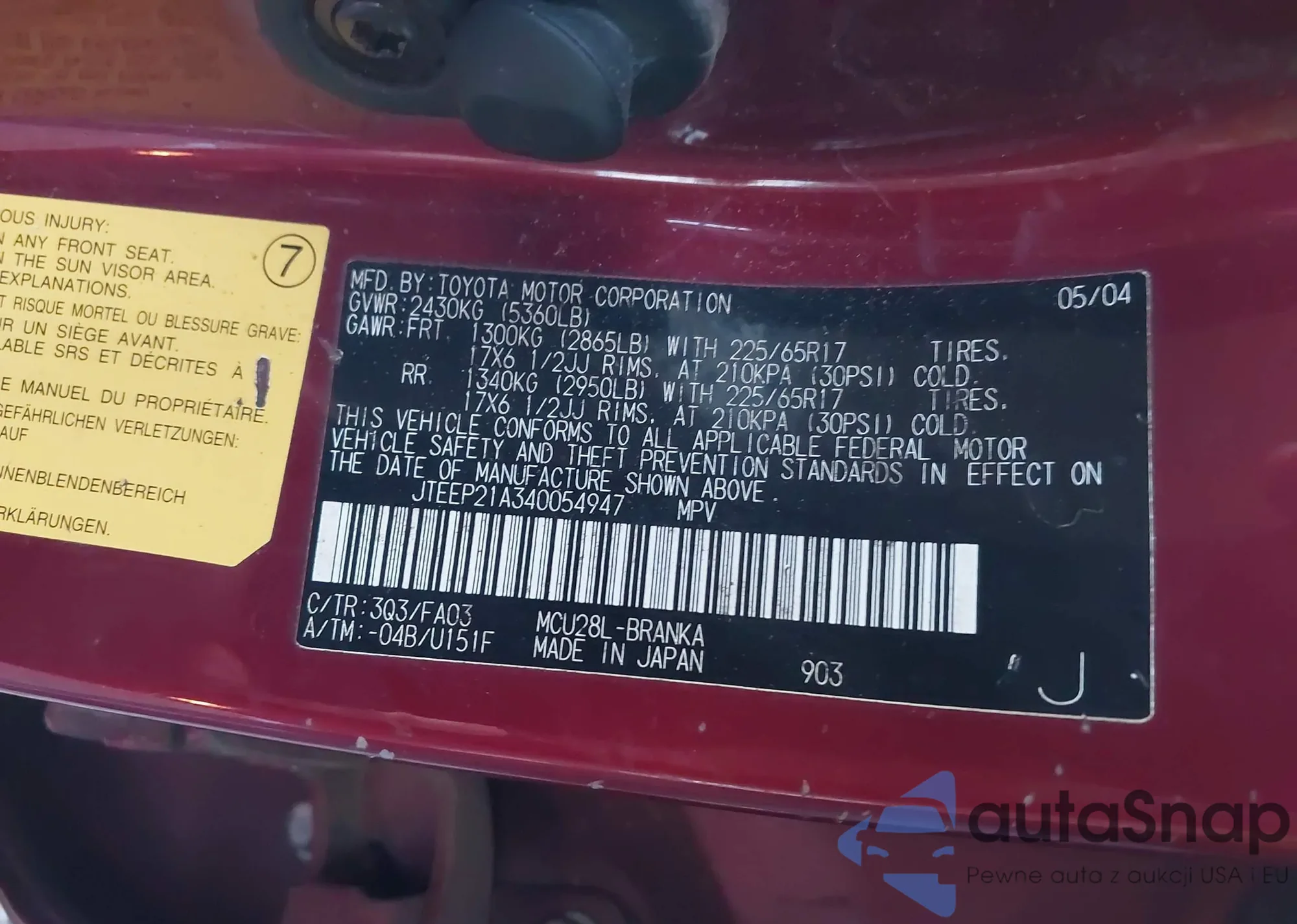 LOT: 43994970 VIN: JTEDP21A550087073