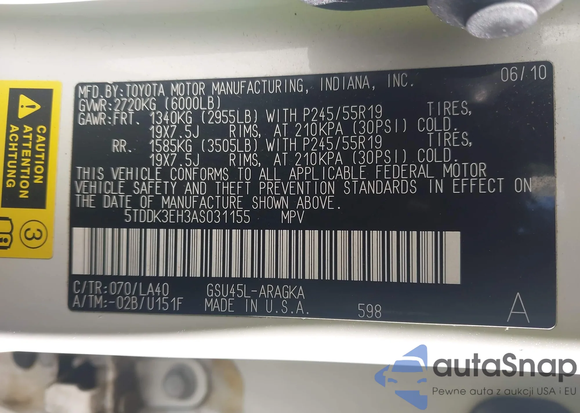 LOT: 43673451 VIN: 5TDDK3EH3AS031155