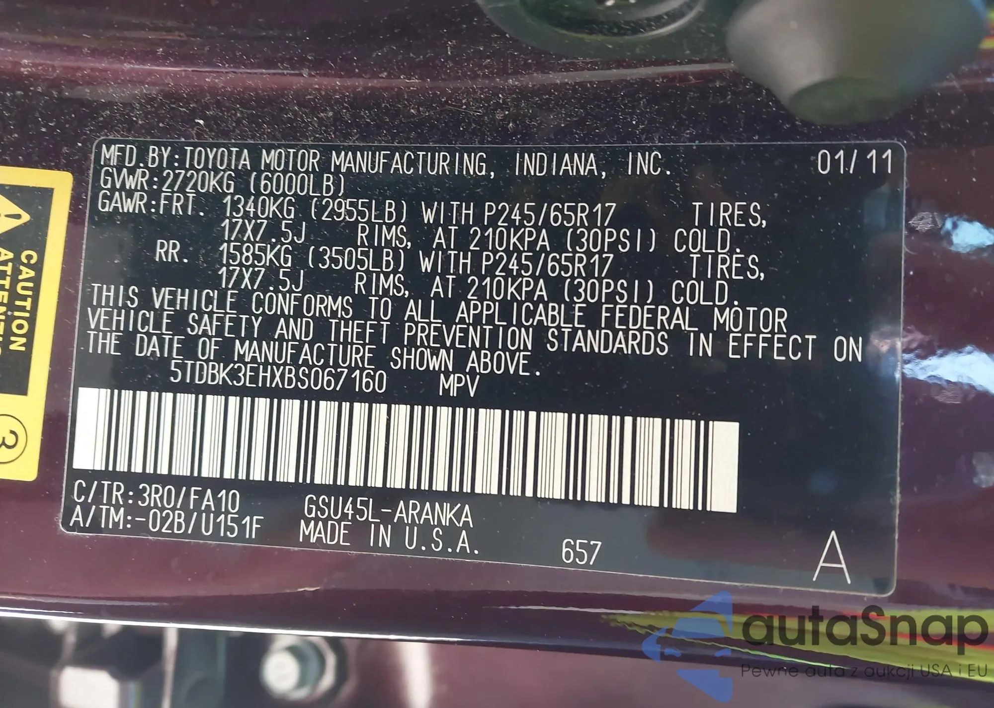 LOT: 43473797 VIN: 5TDBK3EHXBS067160