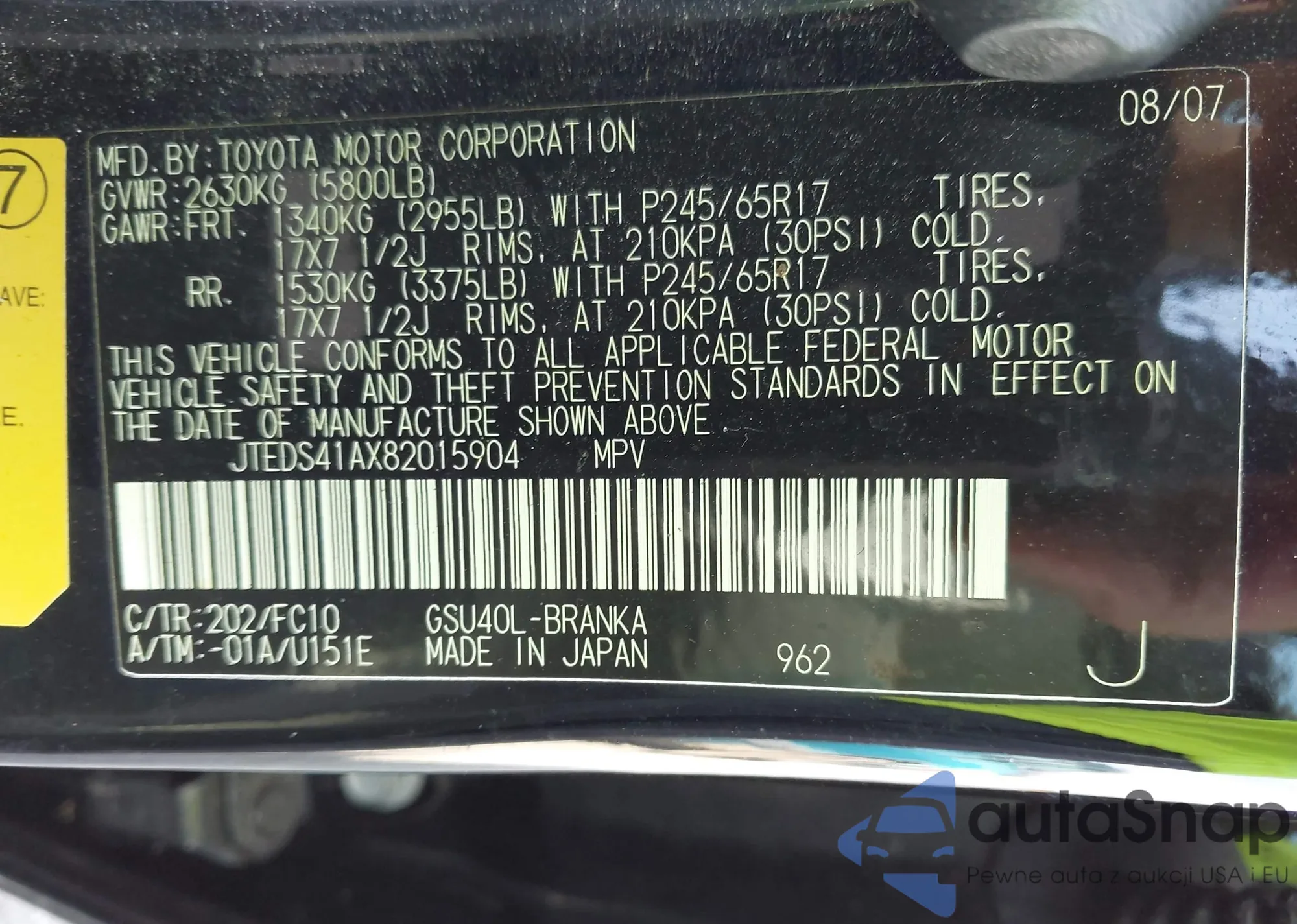 LOT: 44168067 VIN: JTEDS41AX82015904