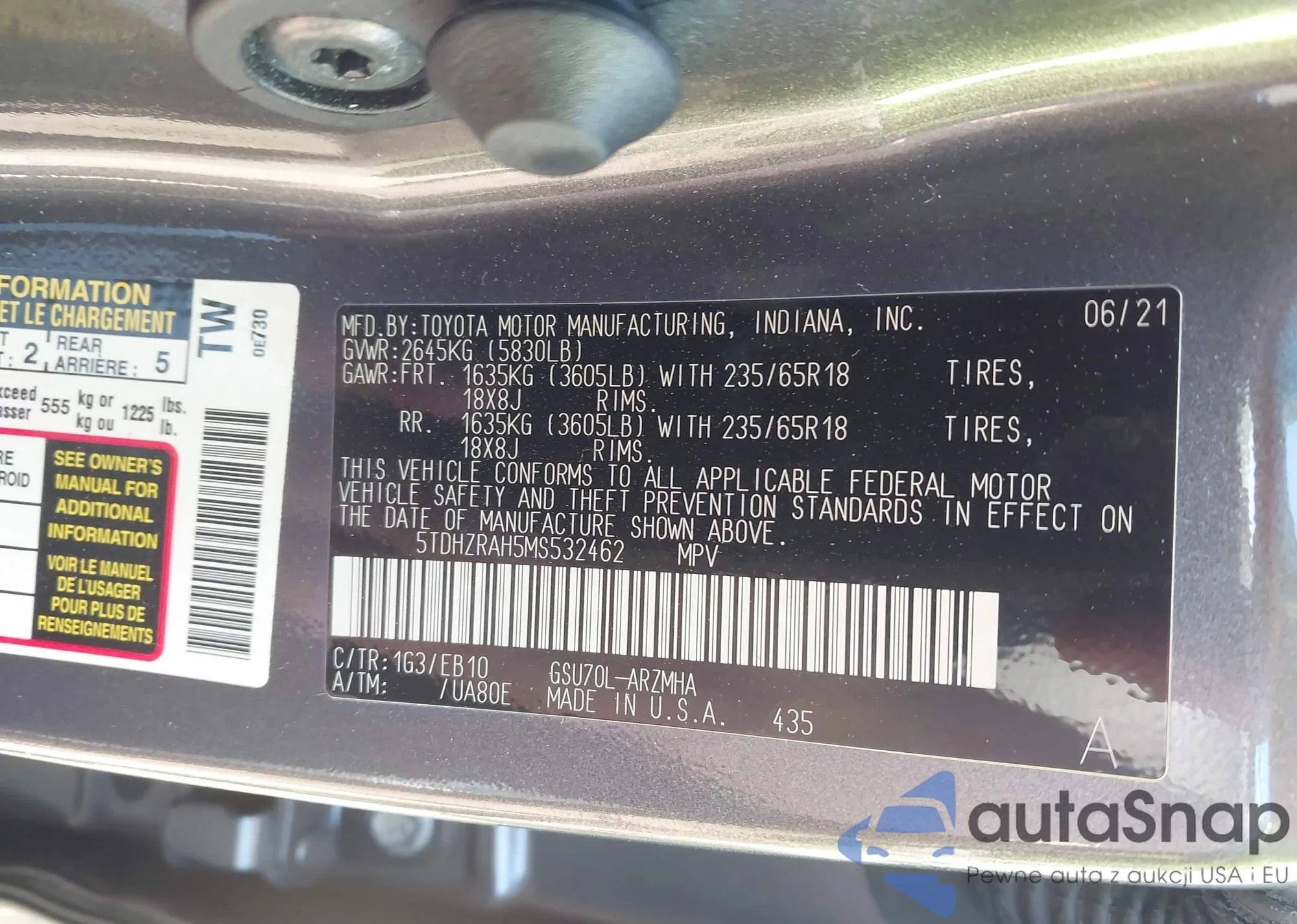 LOT: 43779421 VIN: 5TDHZRAH5MS532462