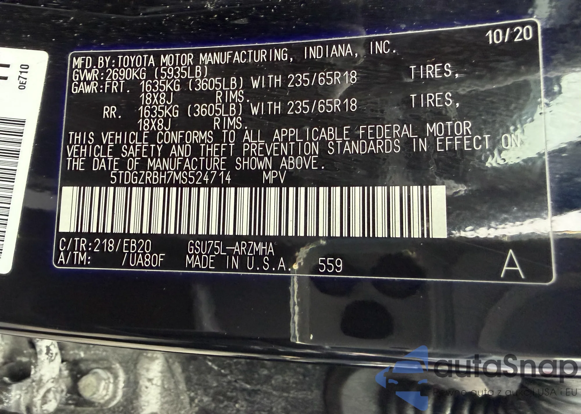LOT: 74369215 VIN: 5TDCZRAH5MS530673