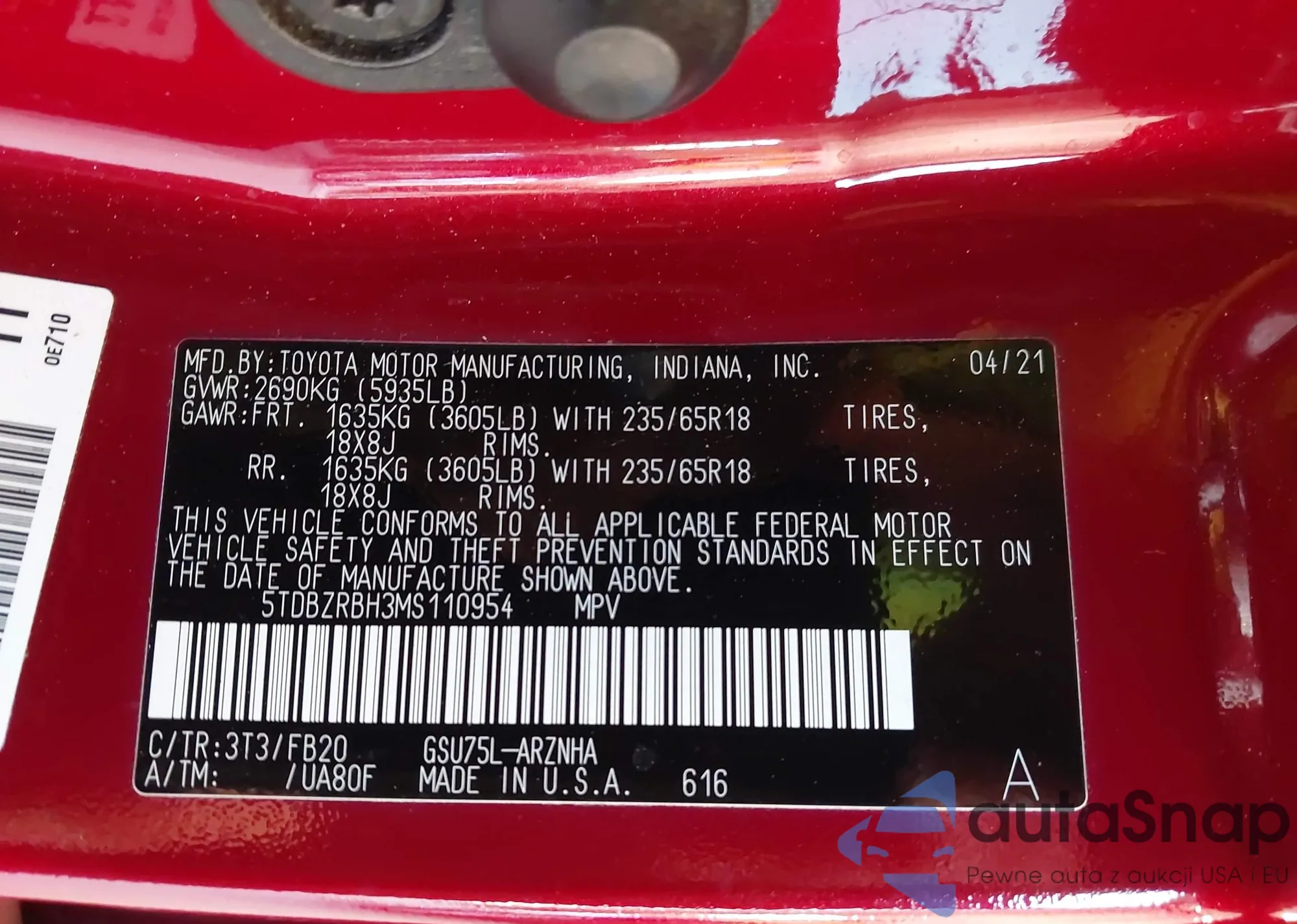 LOT: 43866606 VIN: 5TDBZRBH3MS110954