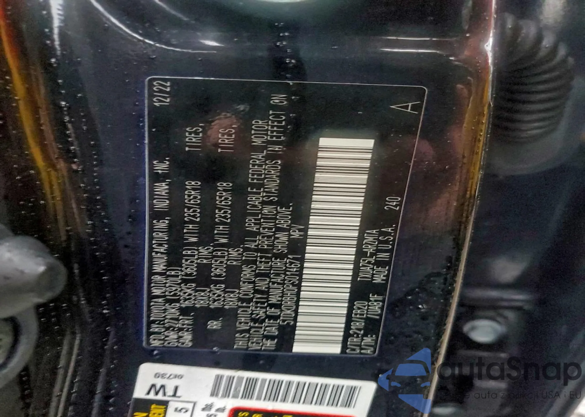 LOT: 97885845 VIN: 5TDKDRBH0PS014671