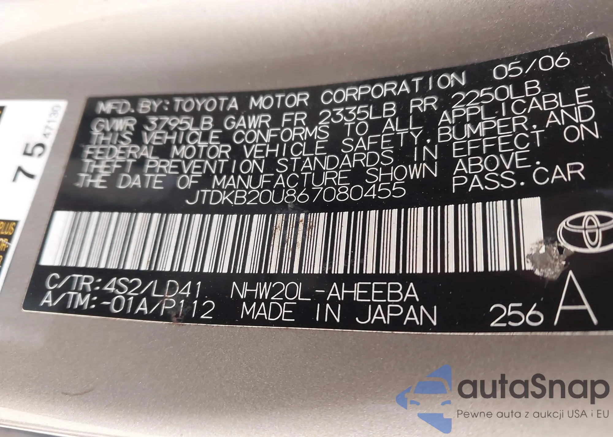 LOT: 43528986 VIN: JTDKB20U867080455