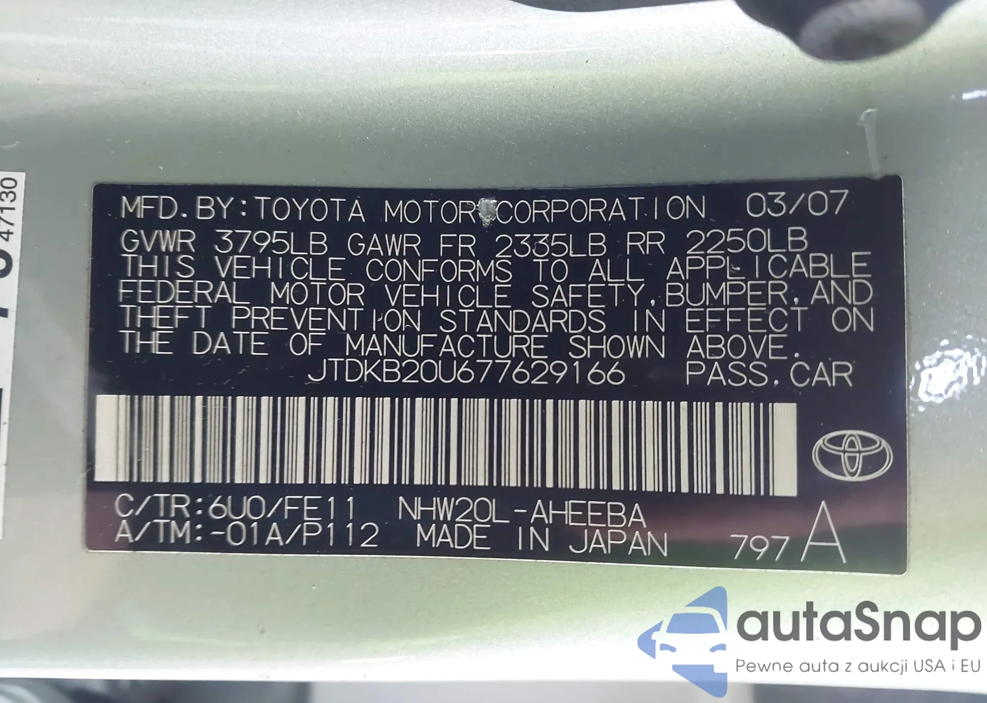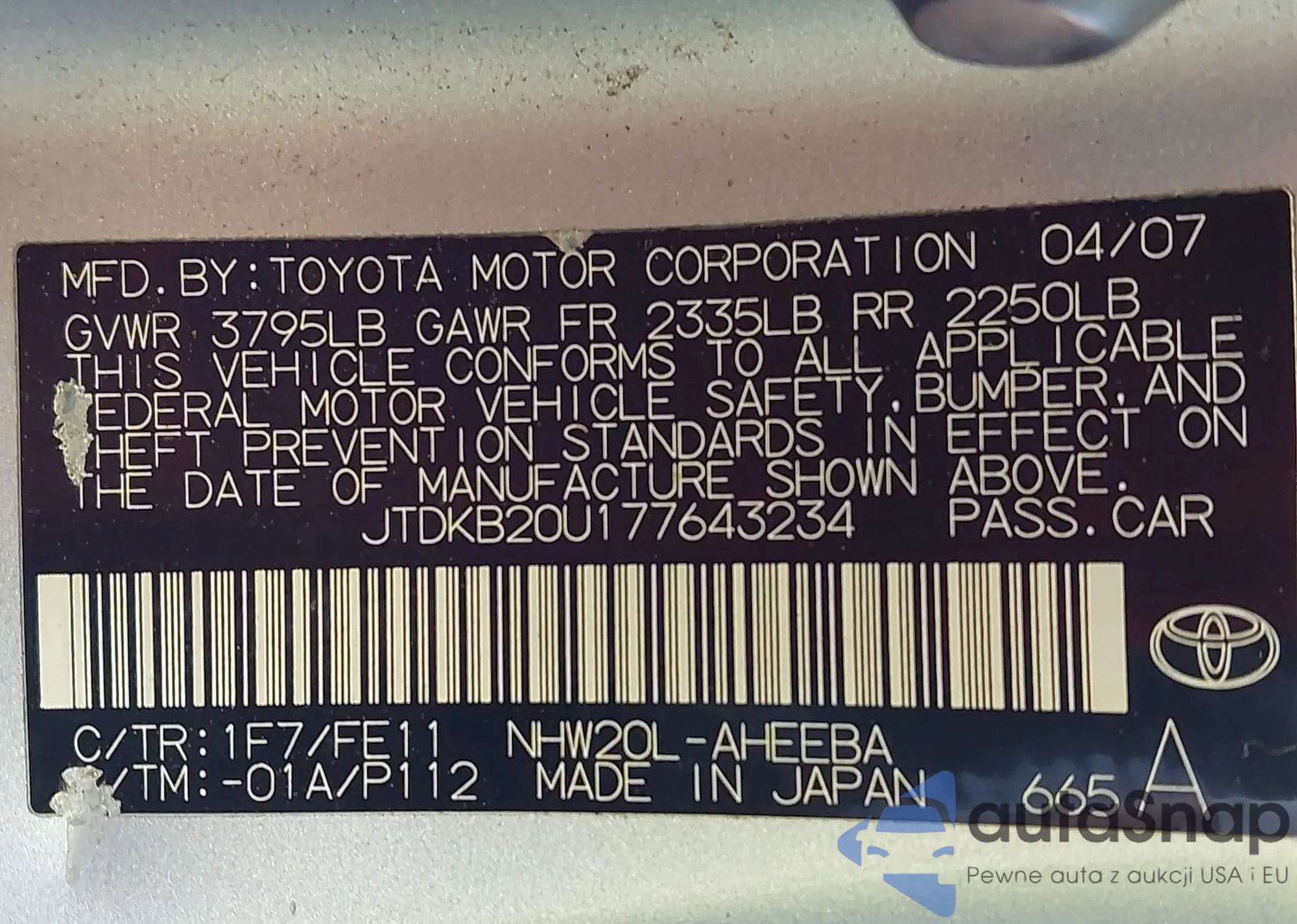 LOT: 44160334 VIN: JTDKB20U677629166