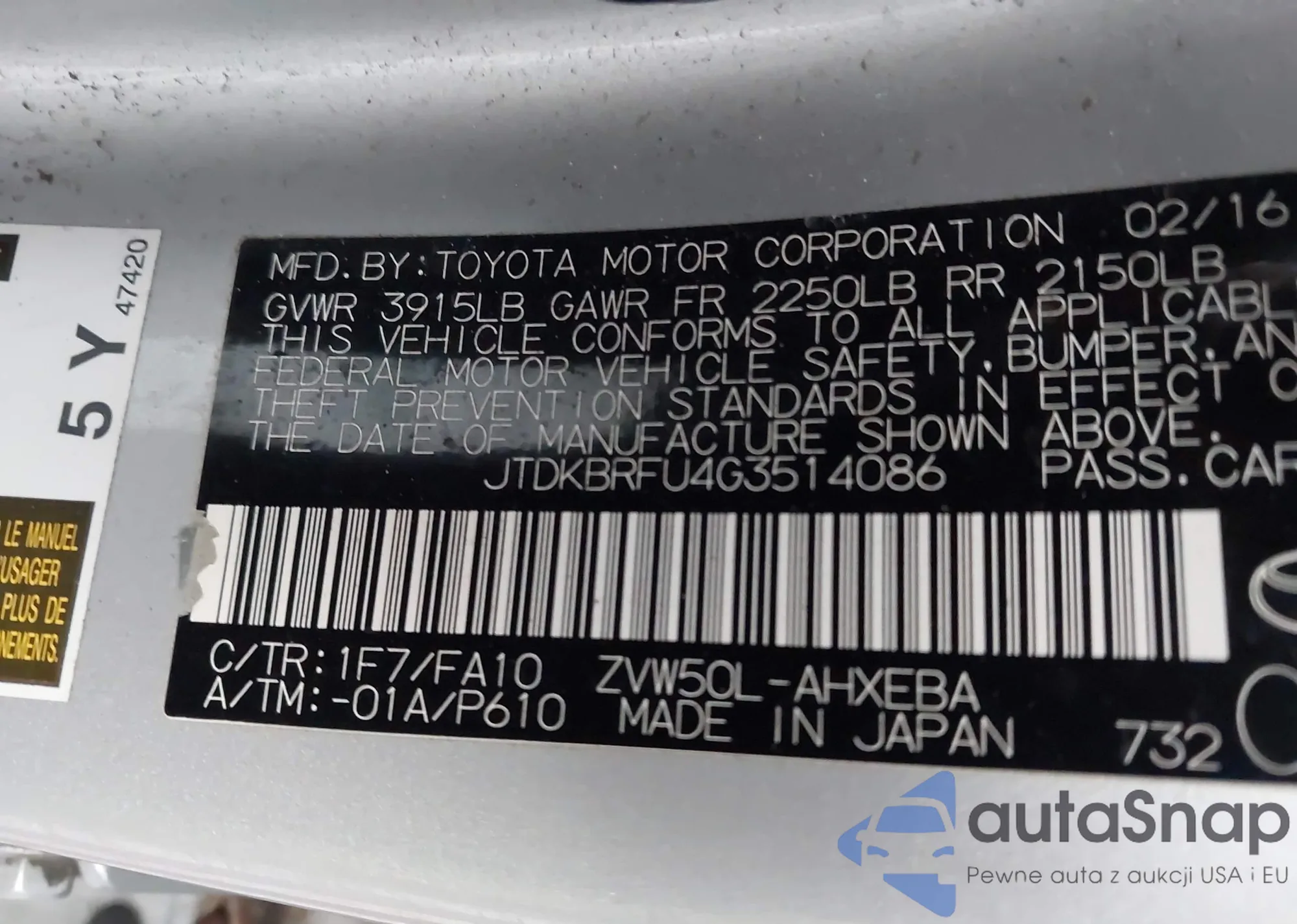 LOT: 44007408 VIN: JTDKBRFU4G3514086