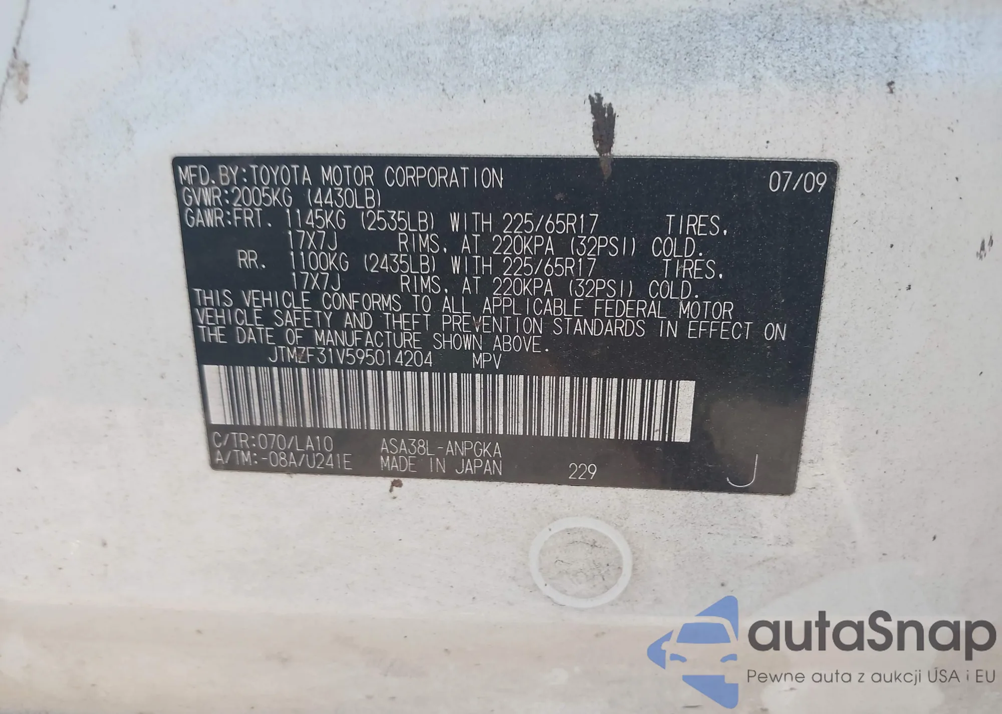 LOT: 40052552 VIN: JTMZF31V595014204