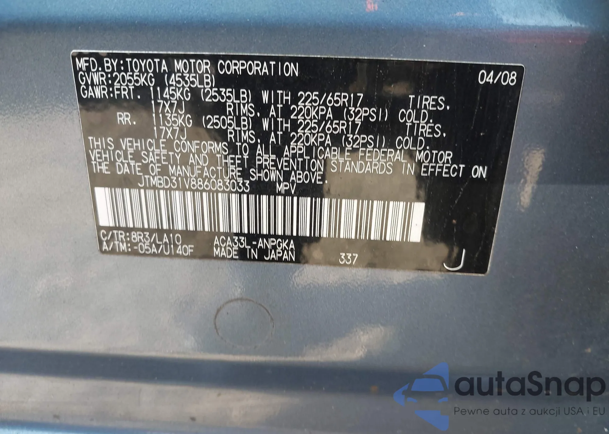 LOT: 20048174 VIN: JTMBK33V185070701